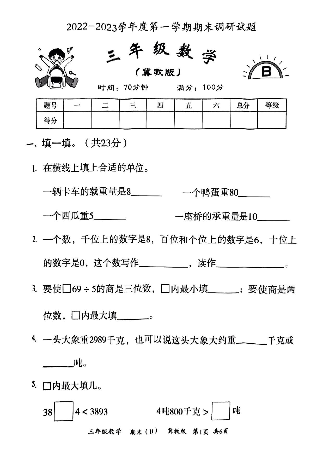 河北省邢台市南宫市2022-2023学年度第一学期期末调研试题三年级数学(冀教版)