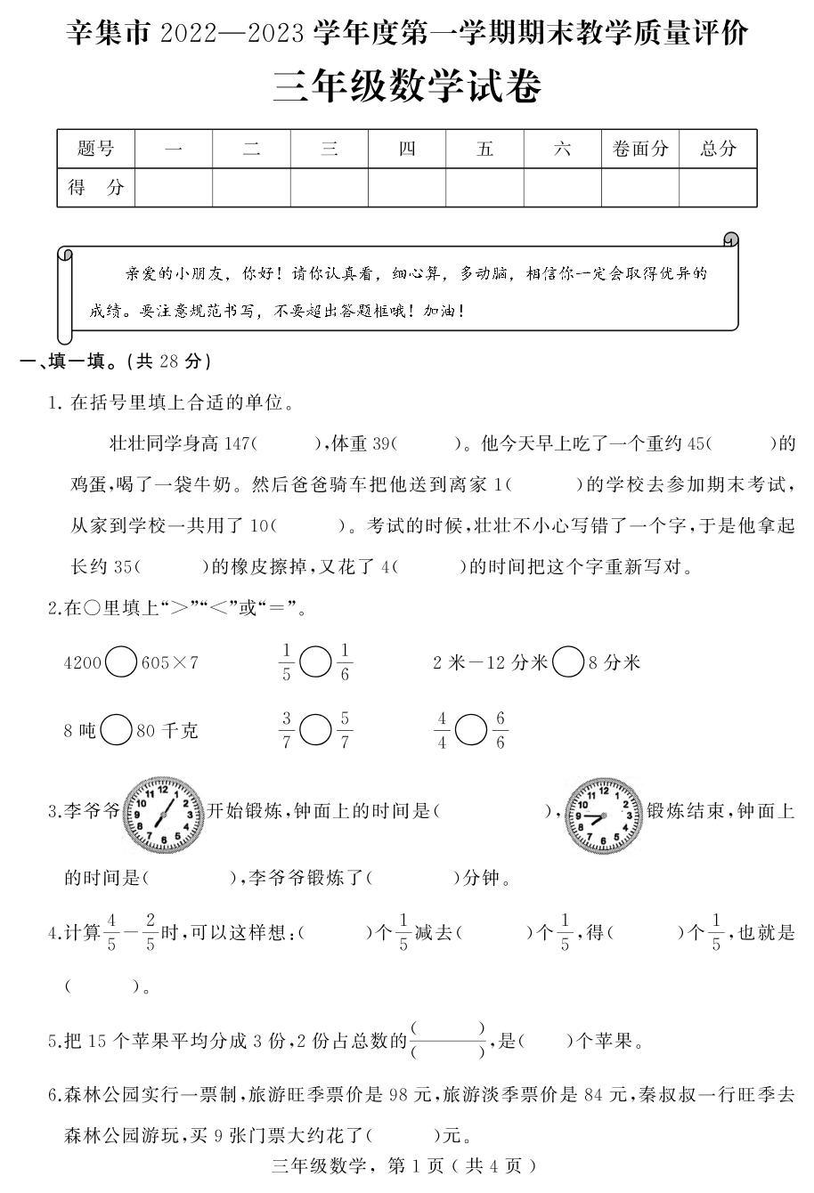 河北省石家庄市辛集市2022-2023学年度第一学期期末教学质量评价三年级数学(人教版)