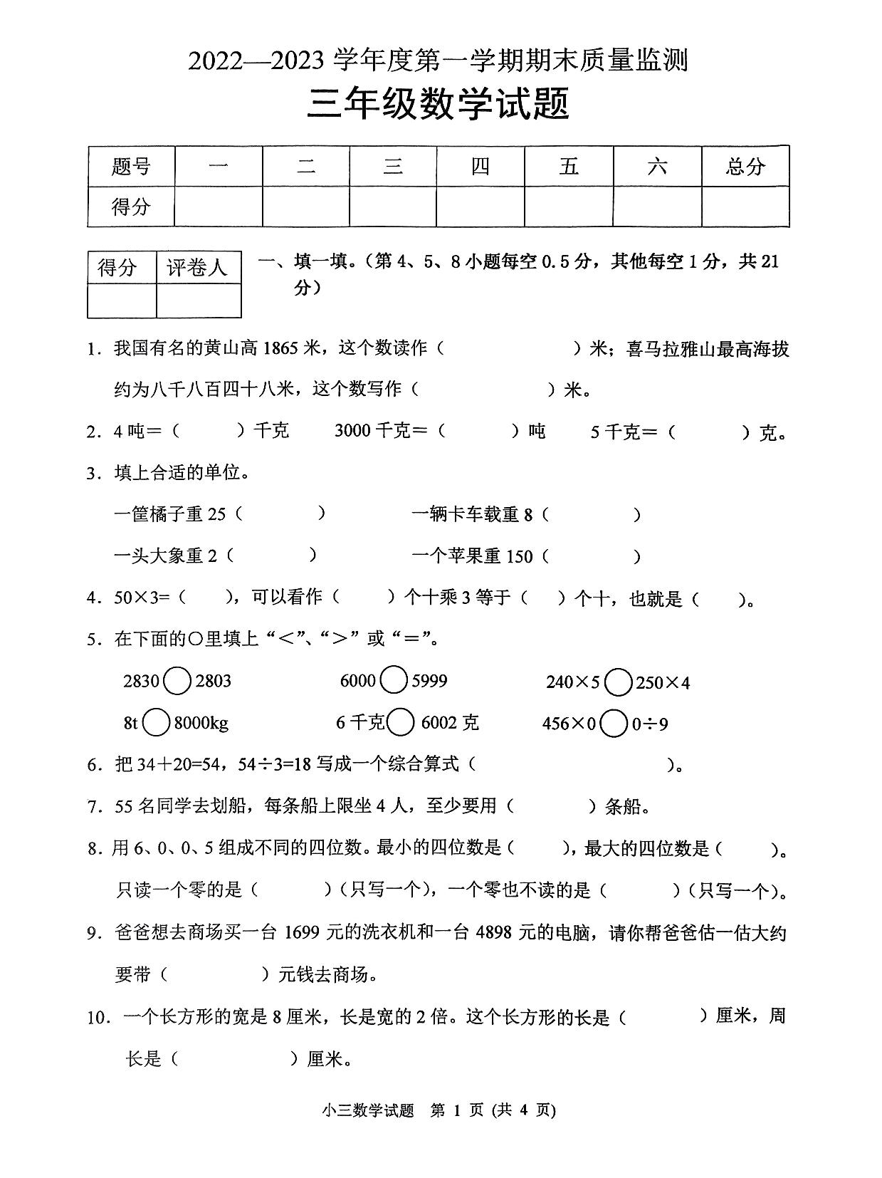 河北省保定市涿州市2022-2023学年度第一学期期末质量监测试题三年级数学(冀教版)