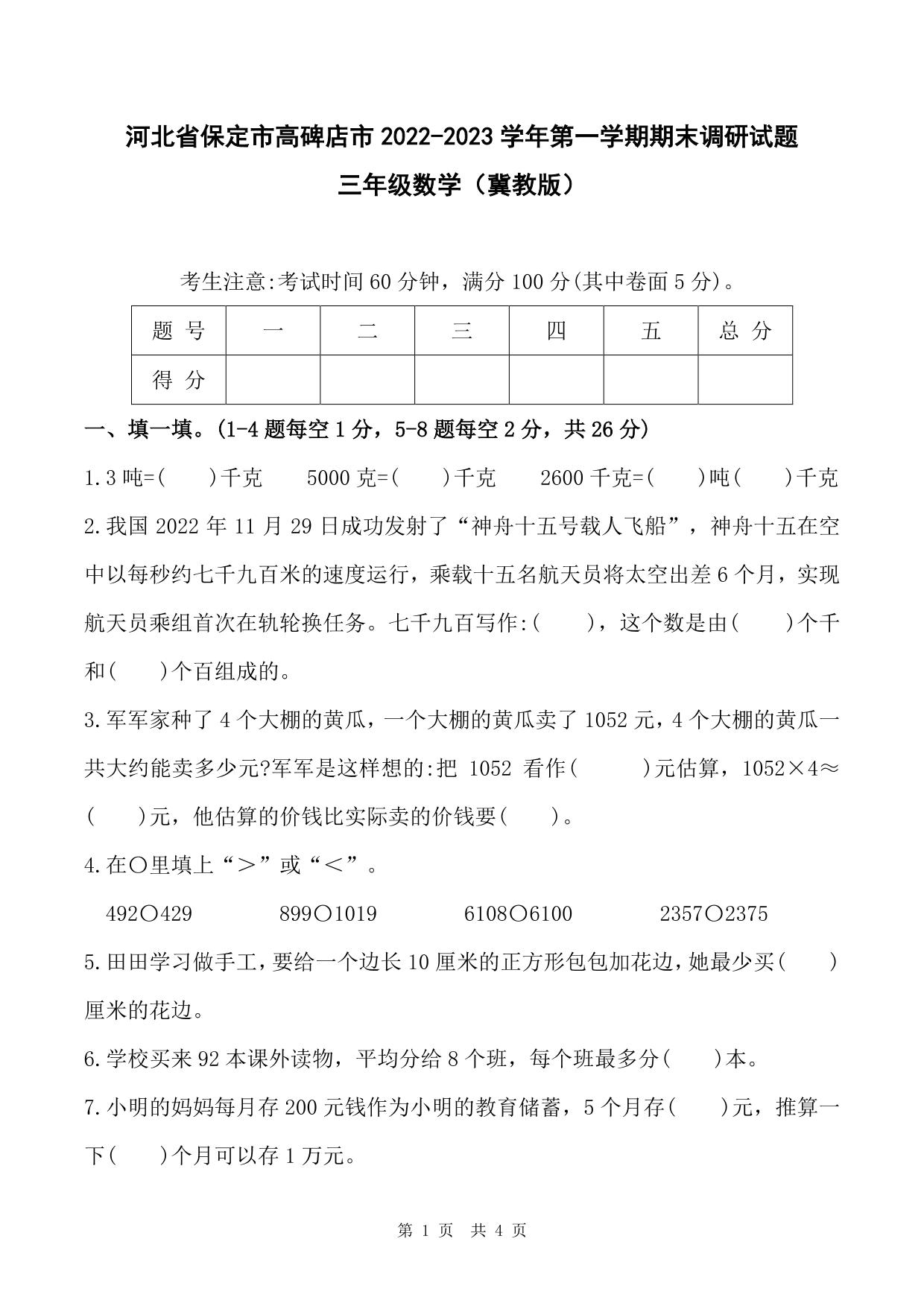 三年级数学冀教版上册期末卷