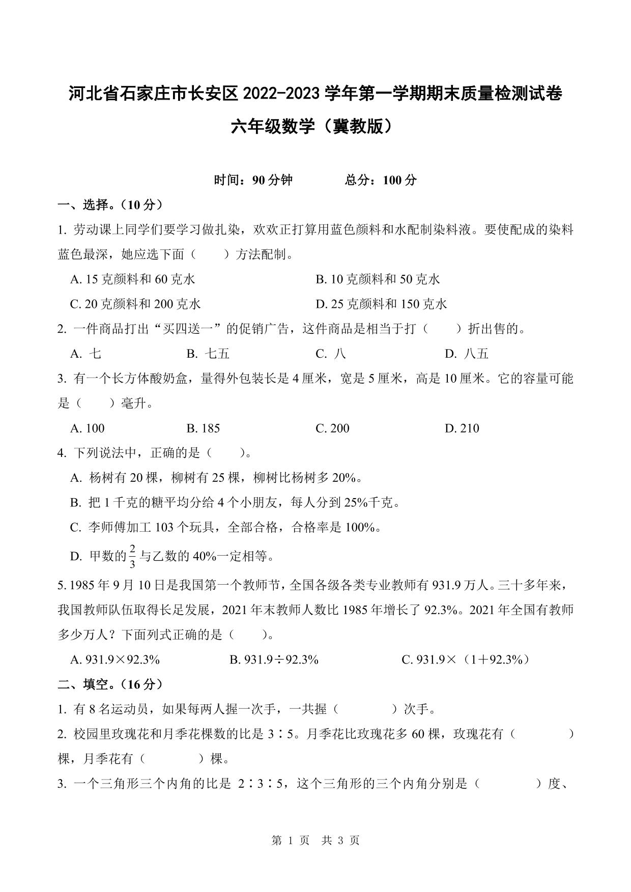 河北省石家庄市长安区2022-2023学年第一学期期末质量检测试卷六年级数学(冀教版)