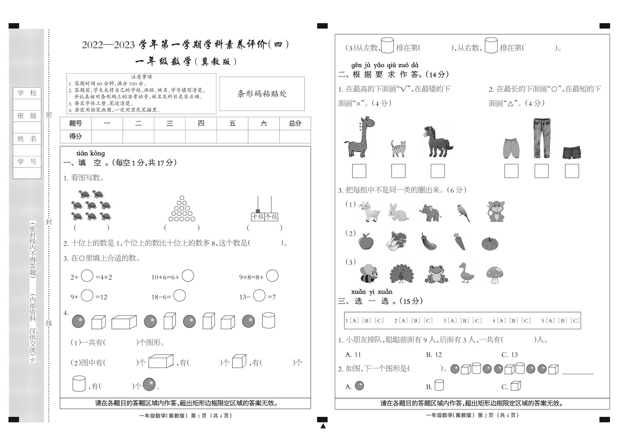 河北省衡水市深州市2022-2023学年第一学期学科素养评价(四)一年级数学(冀教版)