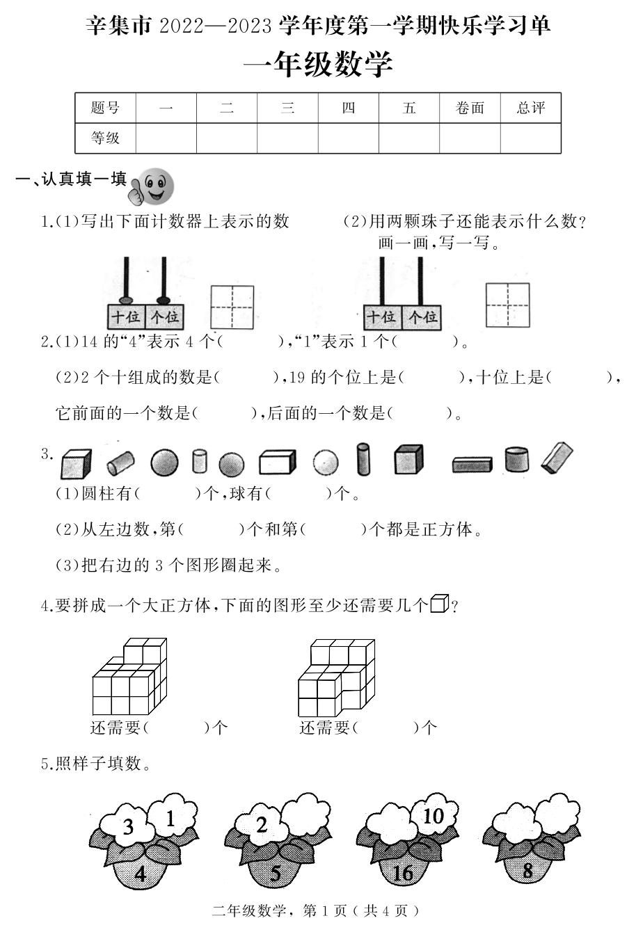 河北省石家庄市辛集市2022-2023学年度第一学期快乐学习单一年级数学(人教版)