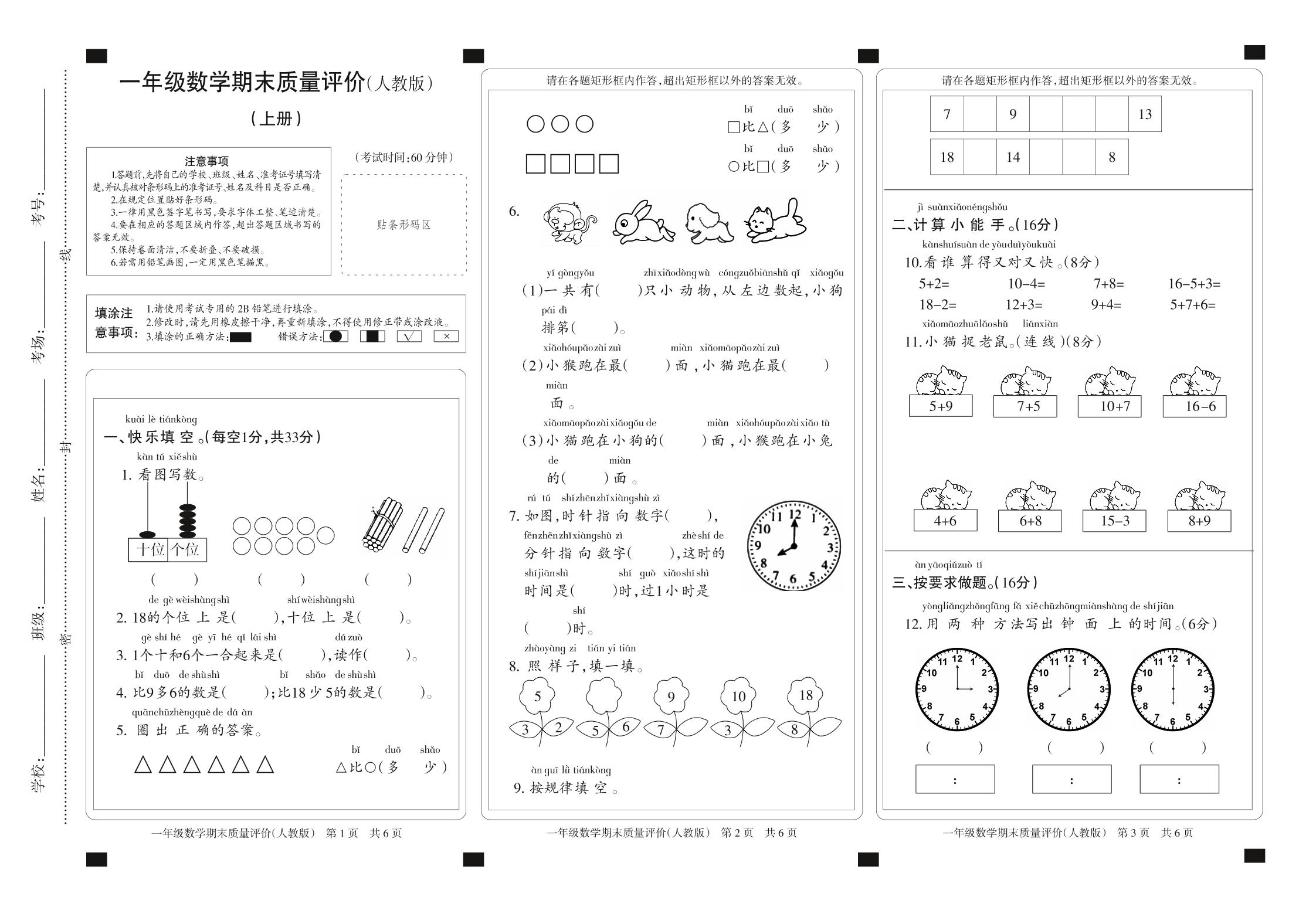 一年级数学人教版上册期末卷