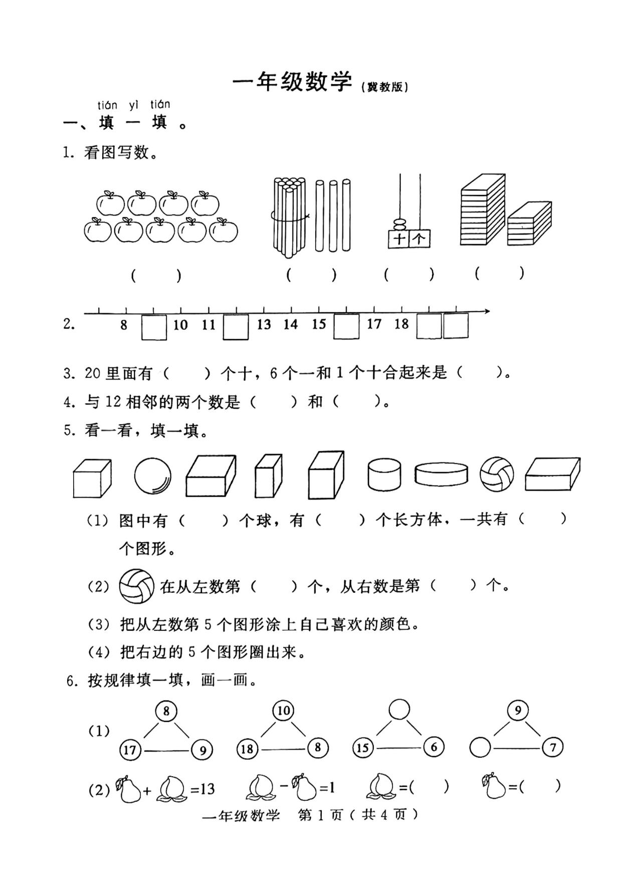一年级数学冀教版上册期末卷