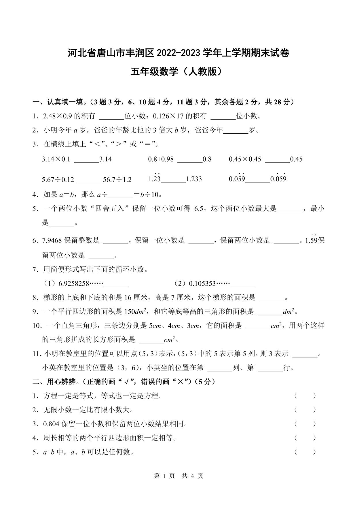 河北省唐山市丰润区2022-2023学年上学期期末试卷五年级数学(人教版)