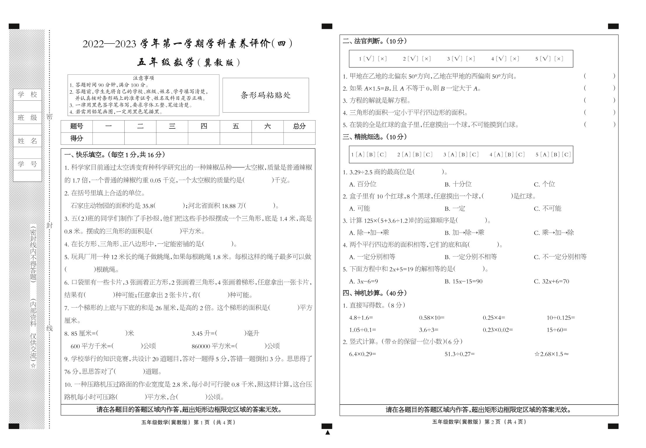 河北省衡水市深州市2022-2023学年第一学期学科素养评价(四)五年级数学(冀教版)
