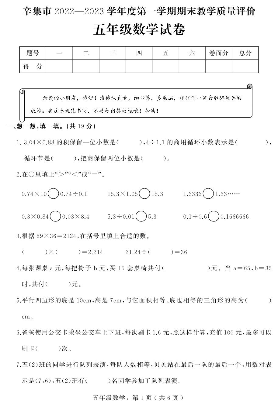 河北省石家庄市辛集市2022-2023学年度第一学期期末教学质量评价五年级数学(人教版)