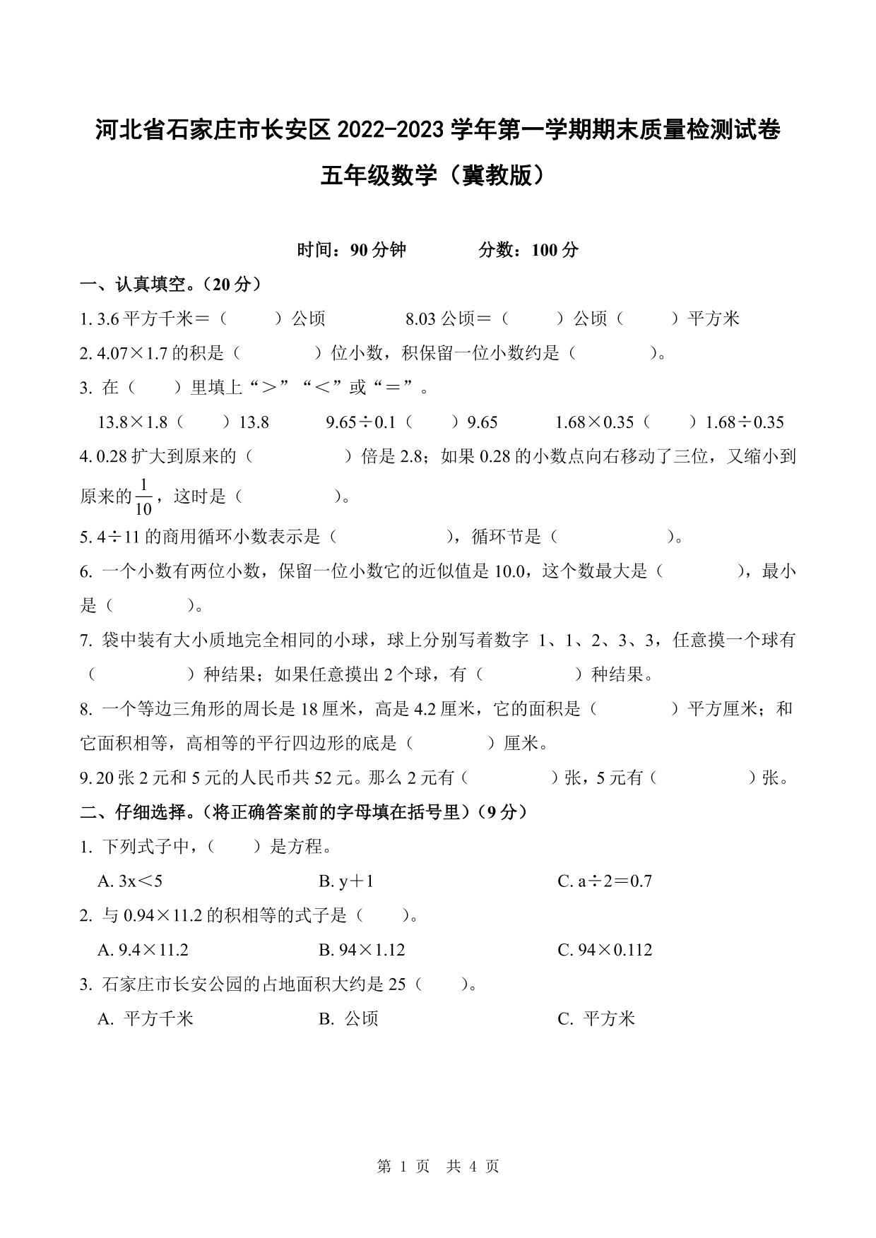 河北省石家庄市长安区2022-2023学年第一学期期末质量检测试卷五年级数学(冀教版)
