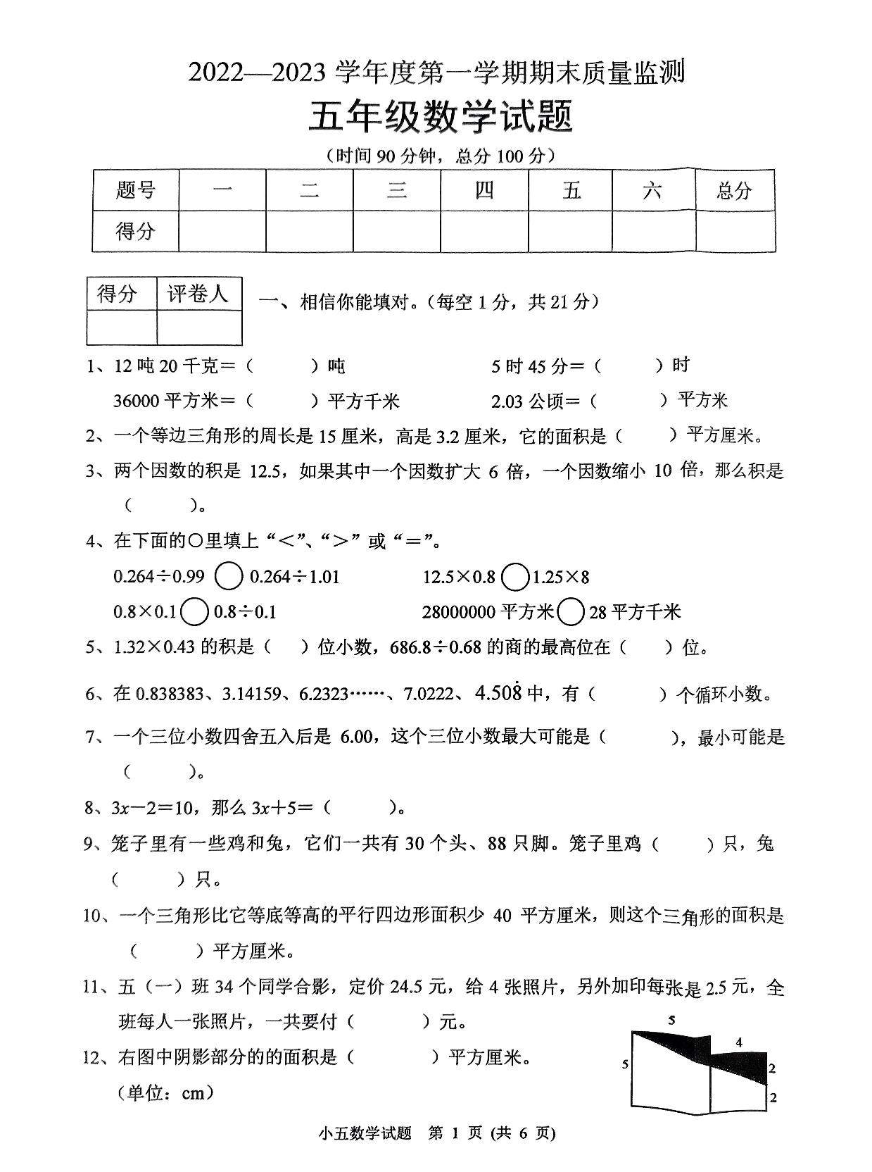 河北省保定市涿州市2022-2023学年度第一学期期末质量监测试题五年级数学(冀教版)