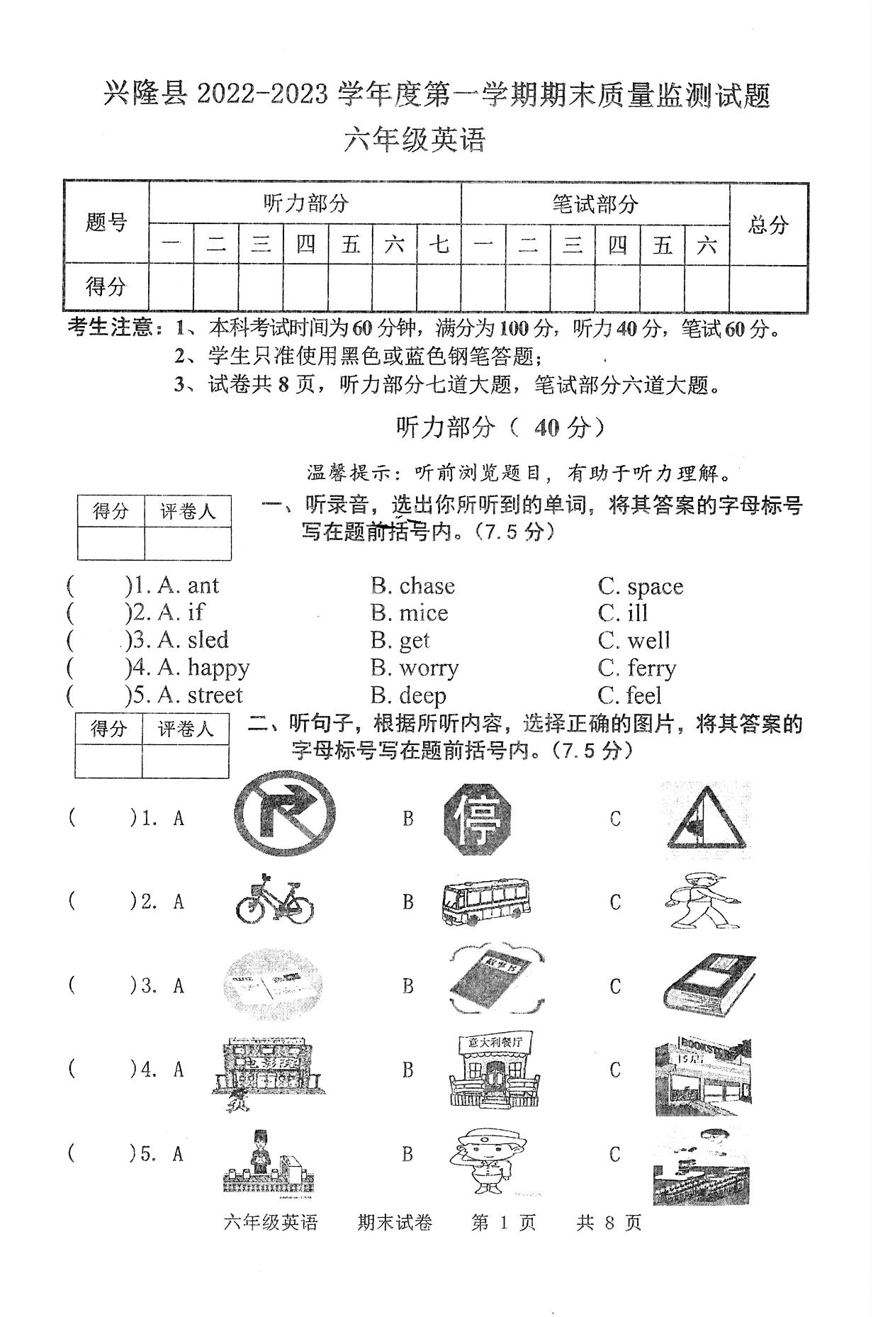 河北省承德市兴隆县2022-2023学年第一学期期末质量检测试题六年级英语(人教PEP版)【无听力音频】