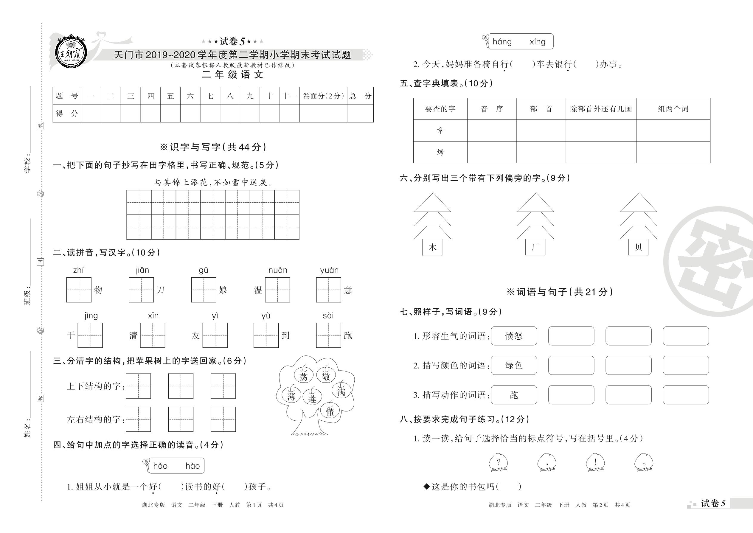 2019-2020学年第二学期天门市二年级语文试卷(人教版)【5】