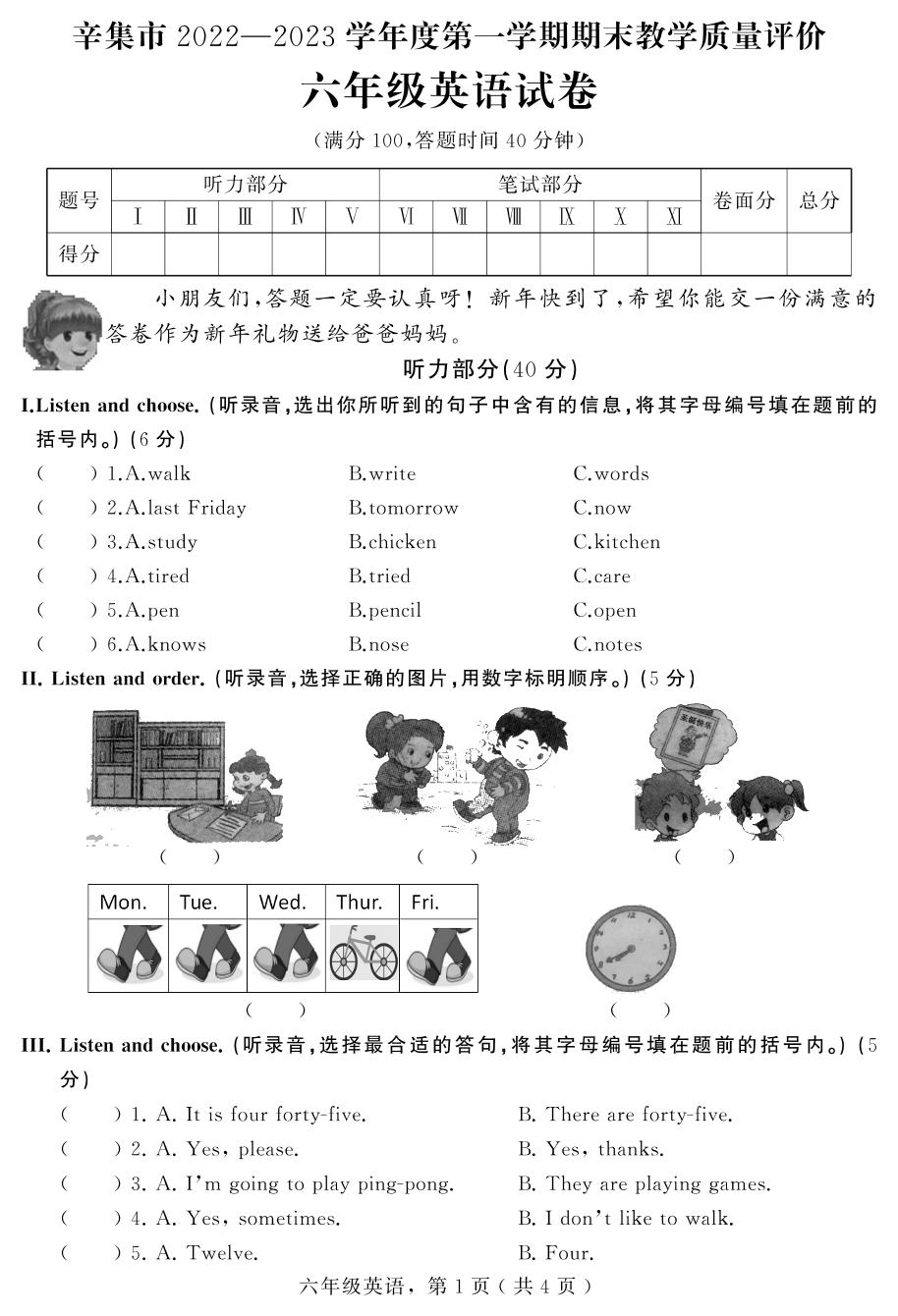 河北省石家庄市辛集市2022-2023学年度第一学期期末教学质量评价试卷六年级英语(人教PEP版)【无听力音频】