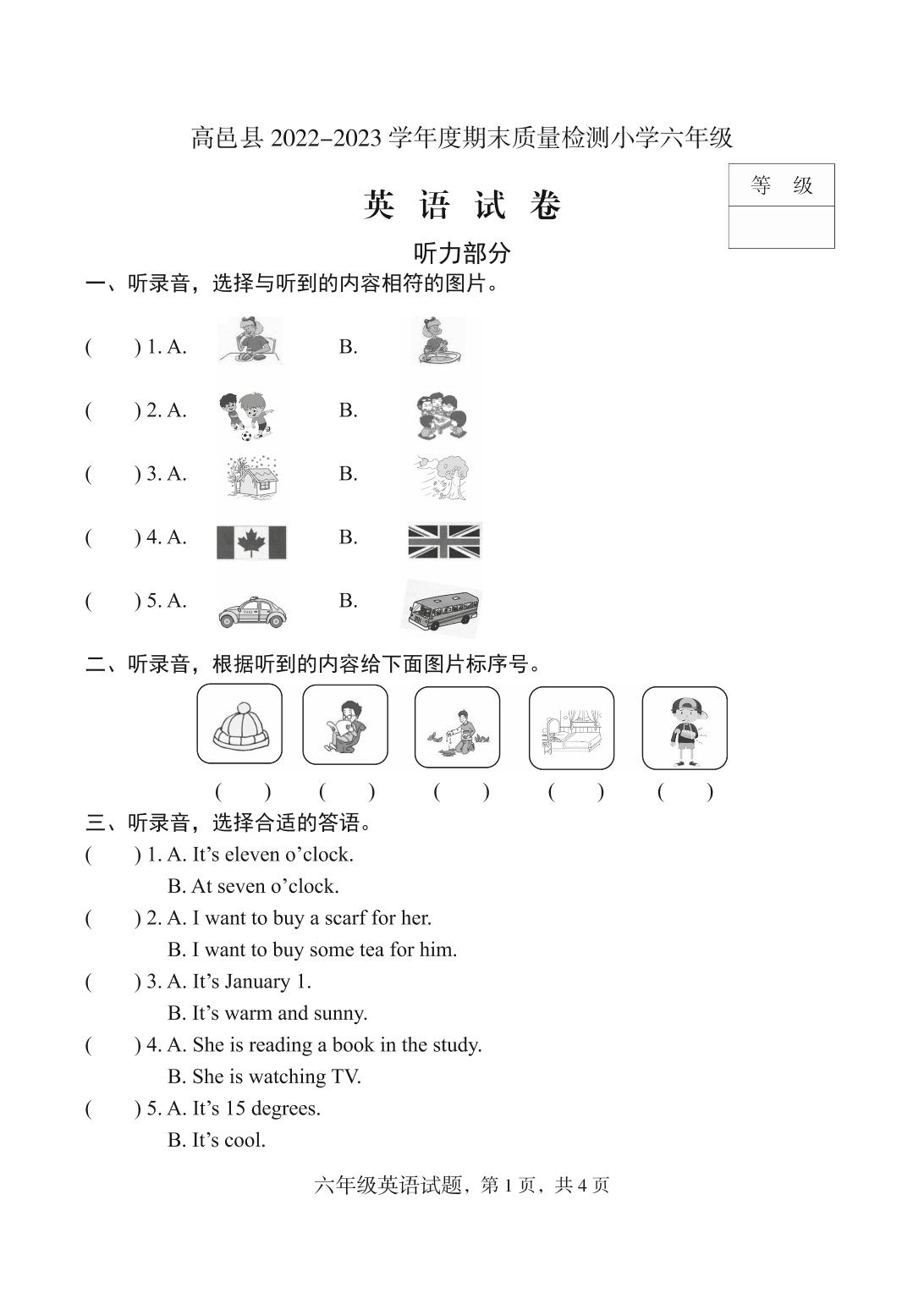 河北省石家庄市高邑县2022-2023学年度第一学期期末质量检测六年级英语(冀教版)【无听力音频】