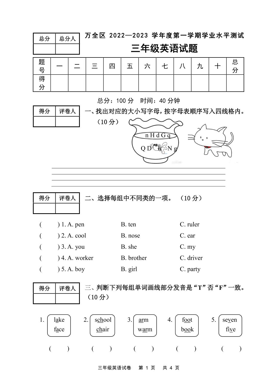 河北省张家口市万全区2022-2023学年度第一学期期末学业水平测试试题三年级英语(冀教版)【无听力音频】