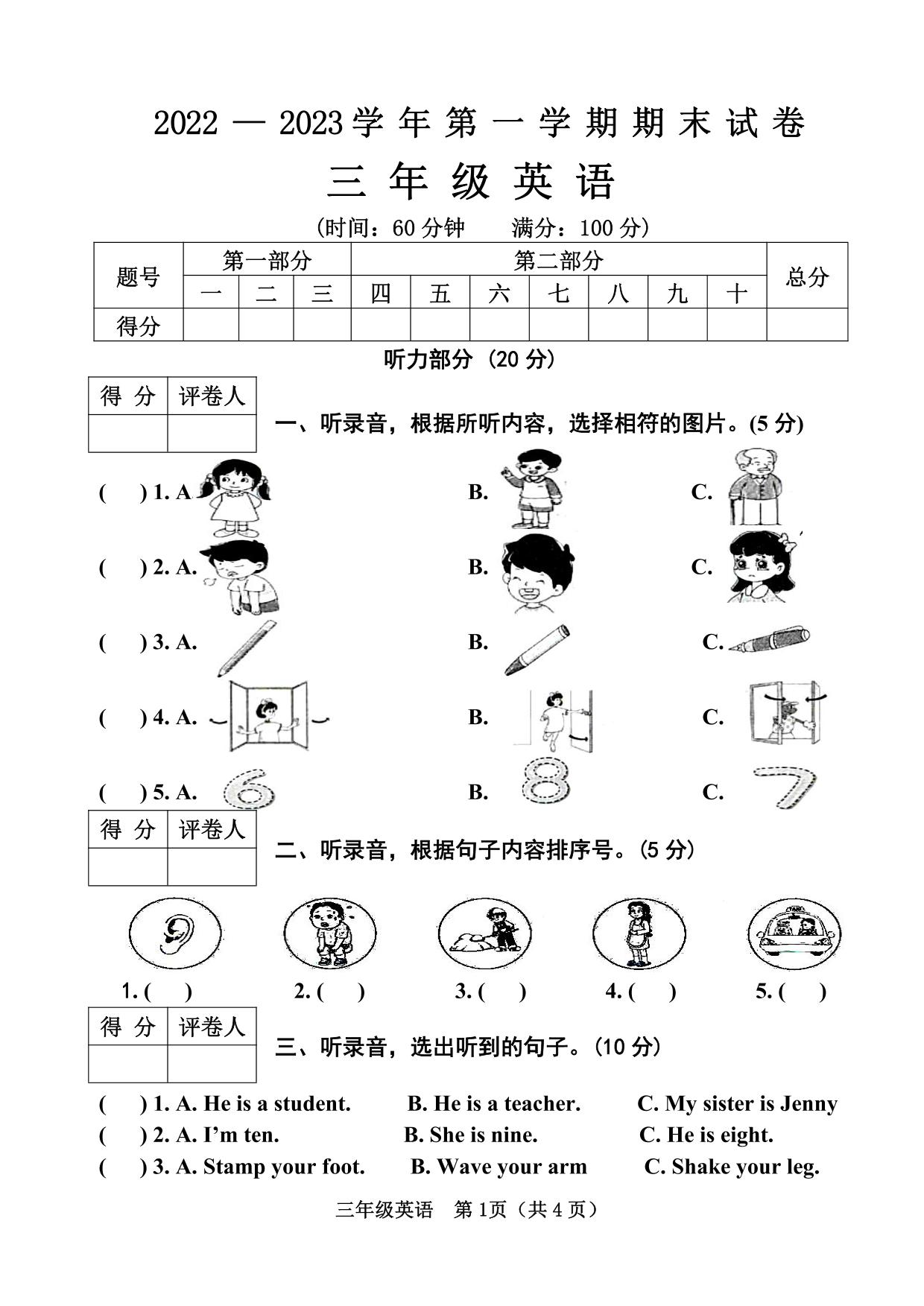河北省邯郸市大名县2022-2023学年第一学期末试卷三年级英语(冀教版)【无听力音频】
