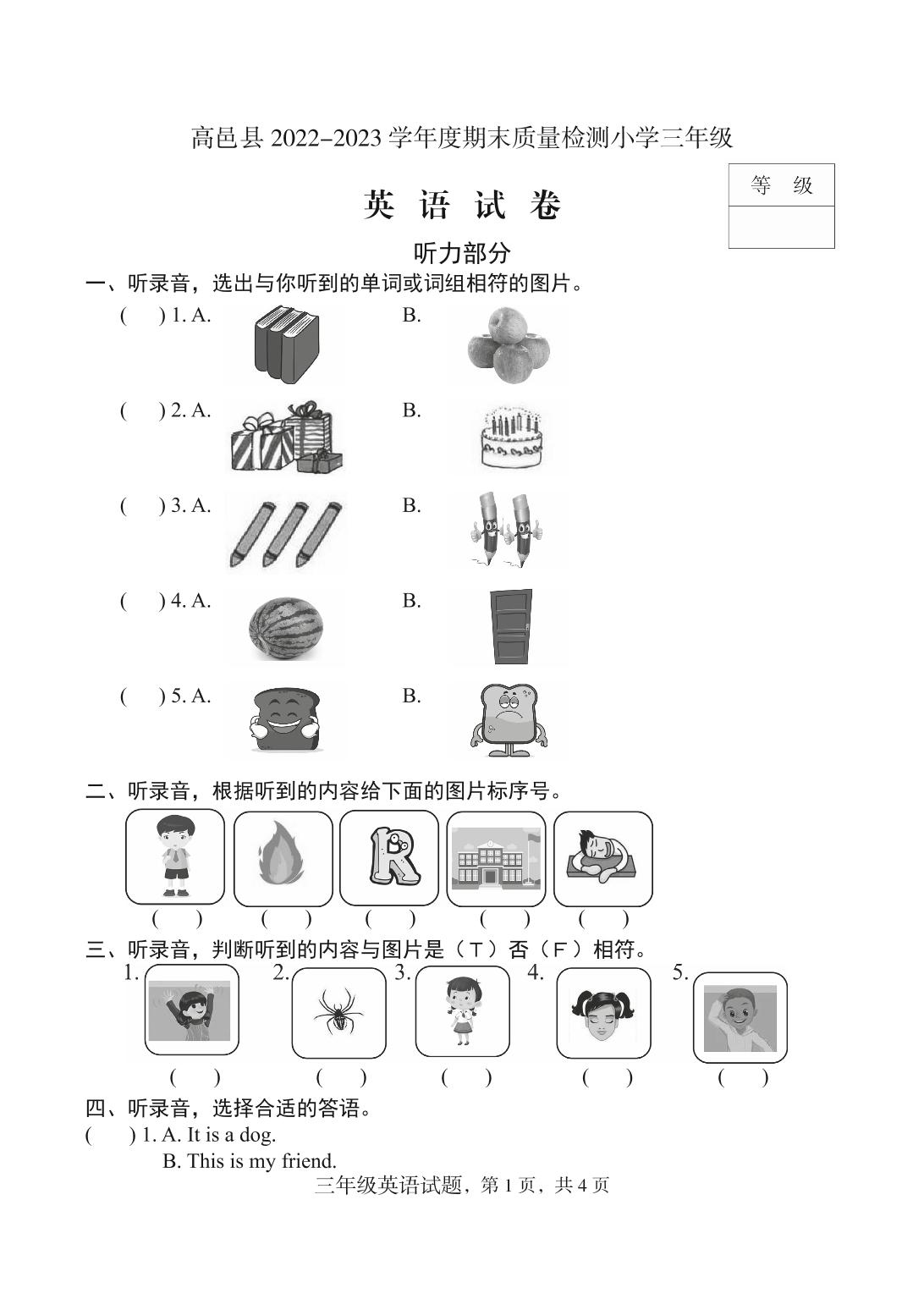 河北省石家庄市高邑县2022-2023学年度第一学期期末质量检测三年级英语(冀教版)【无听力音频】