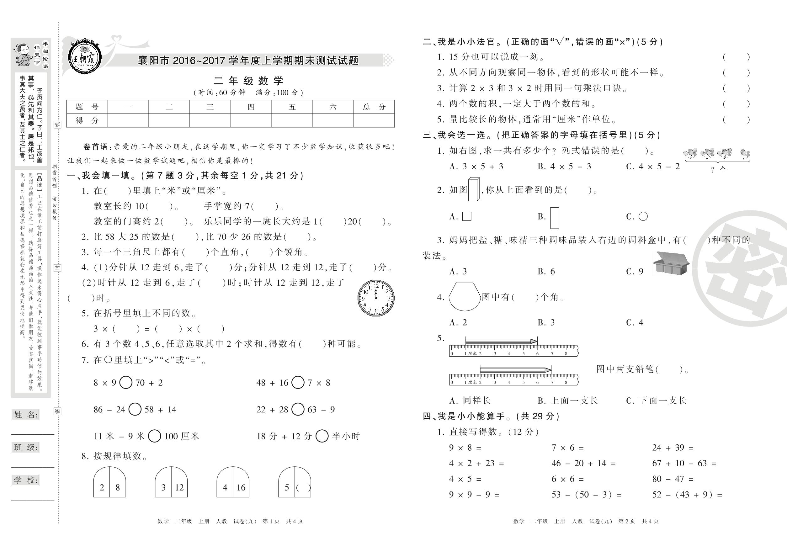 2016-2017学年第一学期襄阳市二年级数学试卷(人教版)【9】