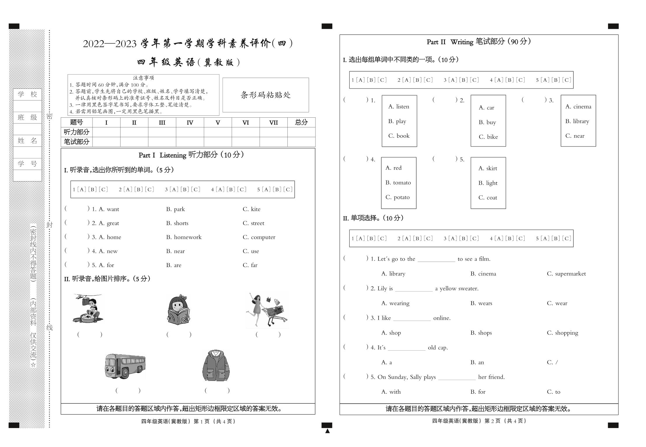 四年级英语冀教版上册期末卷