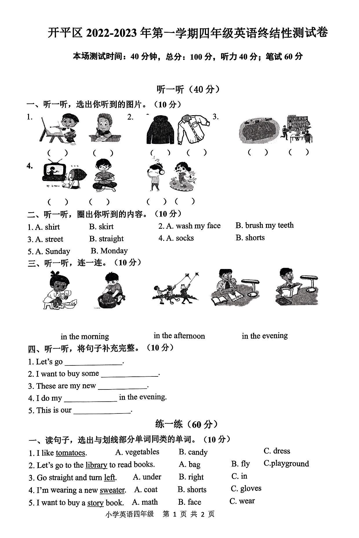 四年级英语冀教版上册期末卷