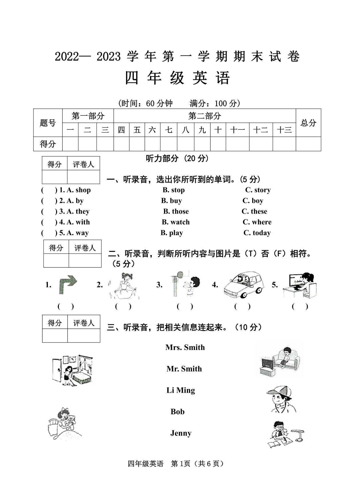 河北省邯郸市大名县2022-2023学年第一学期末试卷四年级英语(冀教版)【无听力音频】