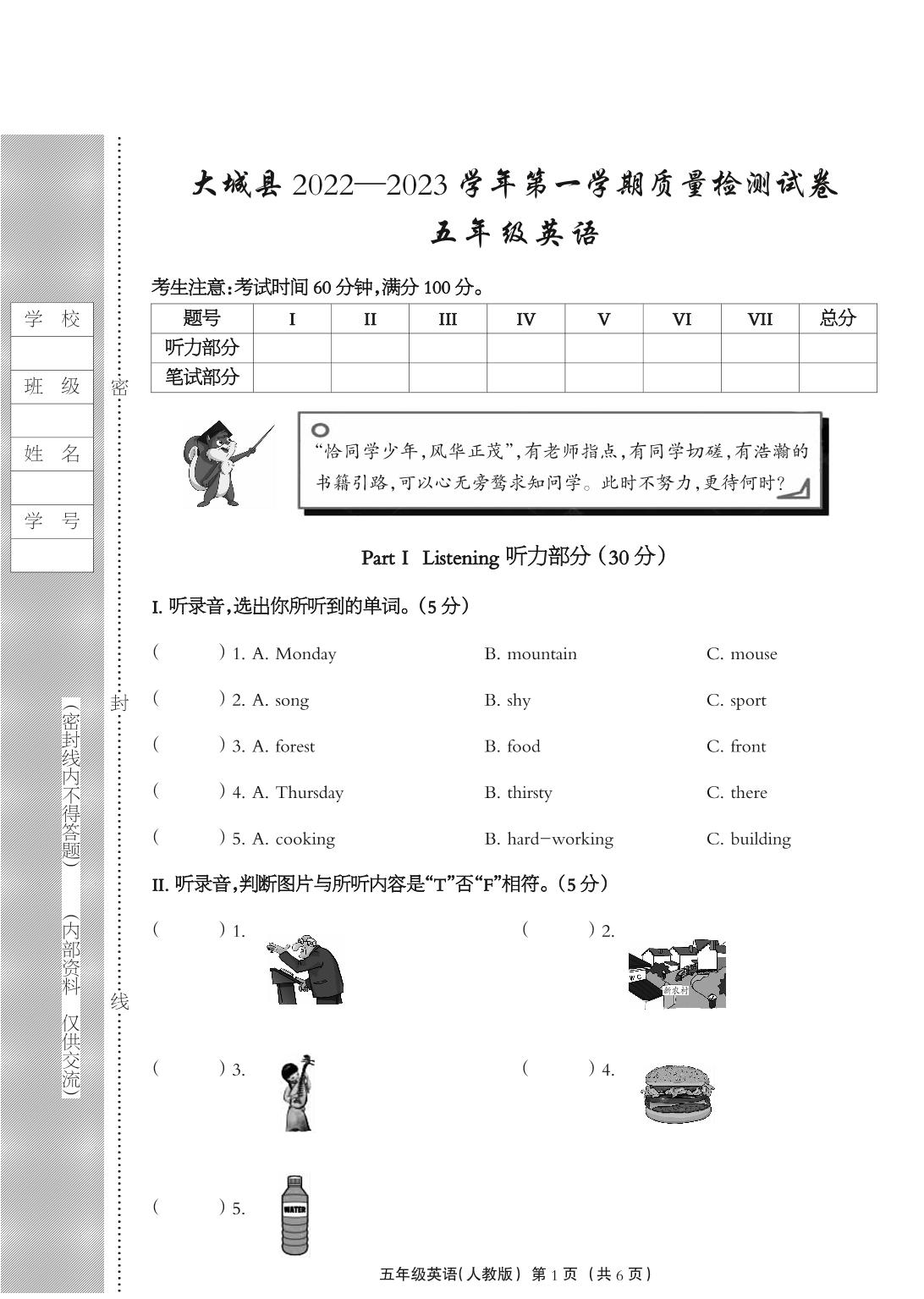 河北省廊坊市大城县2022-2023学年第一学期期末质量检测试卷五年级英语(人教PEP版)【无听力音频】