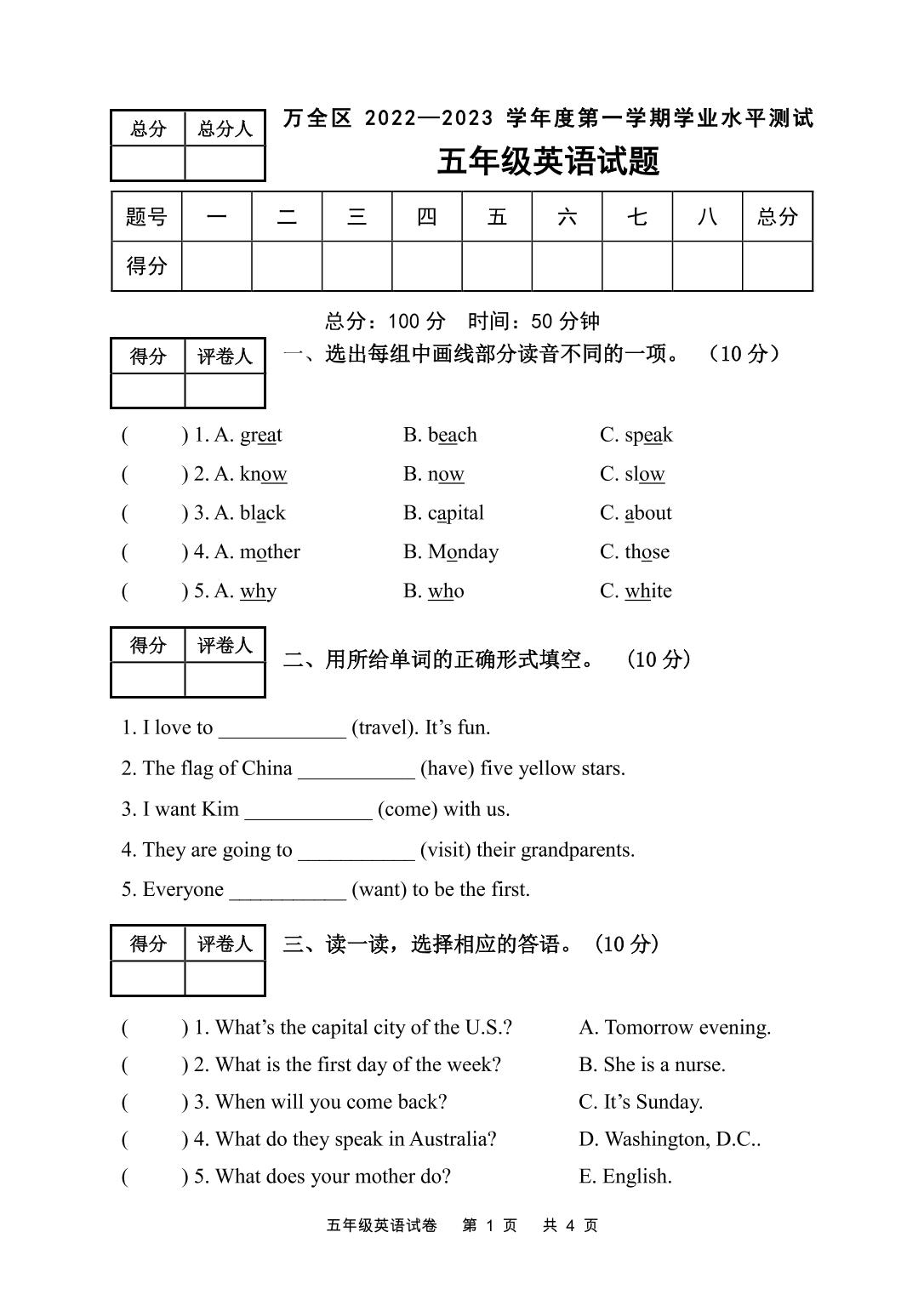 河北省张家口市万全区2022-2023学年度第一学期期末学业水平测试试题五年级英语(冀教版)【无听力音频】