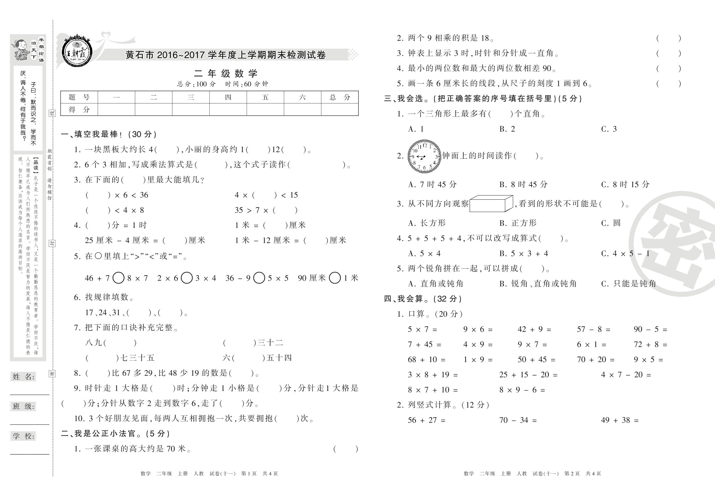 2016-2017学年第一学期黄石市二年级数学试卷(人教版)【11】