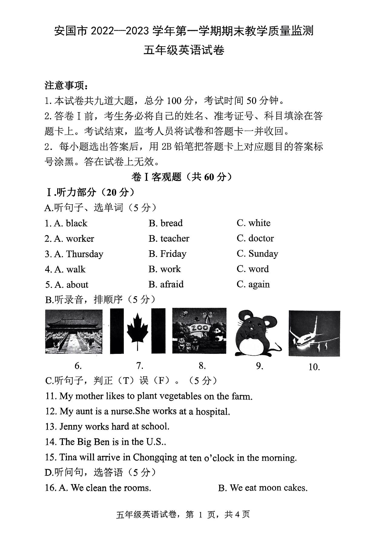 河北省保定市安国市2022-2023学年度第一学期期末教学质量监测五年级英语(冀教版)【无听力音频】