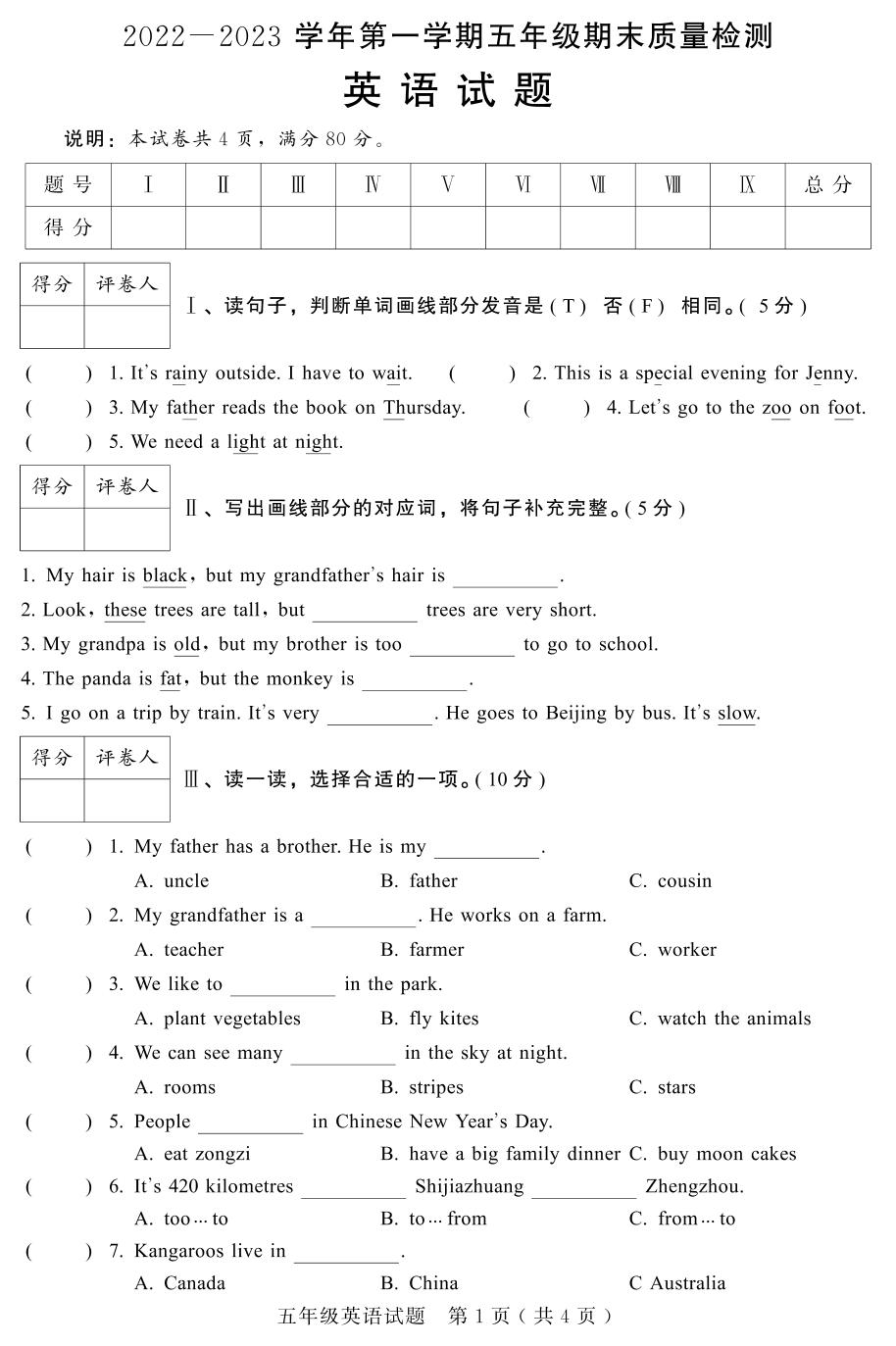 河北省邯郸市邱县2022-2023学年第一学期期末质量检测试题五年级英语(冀教版)【无听力音频】