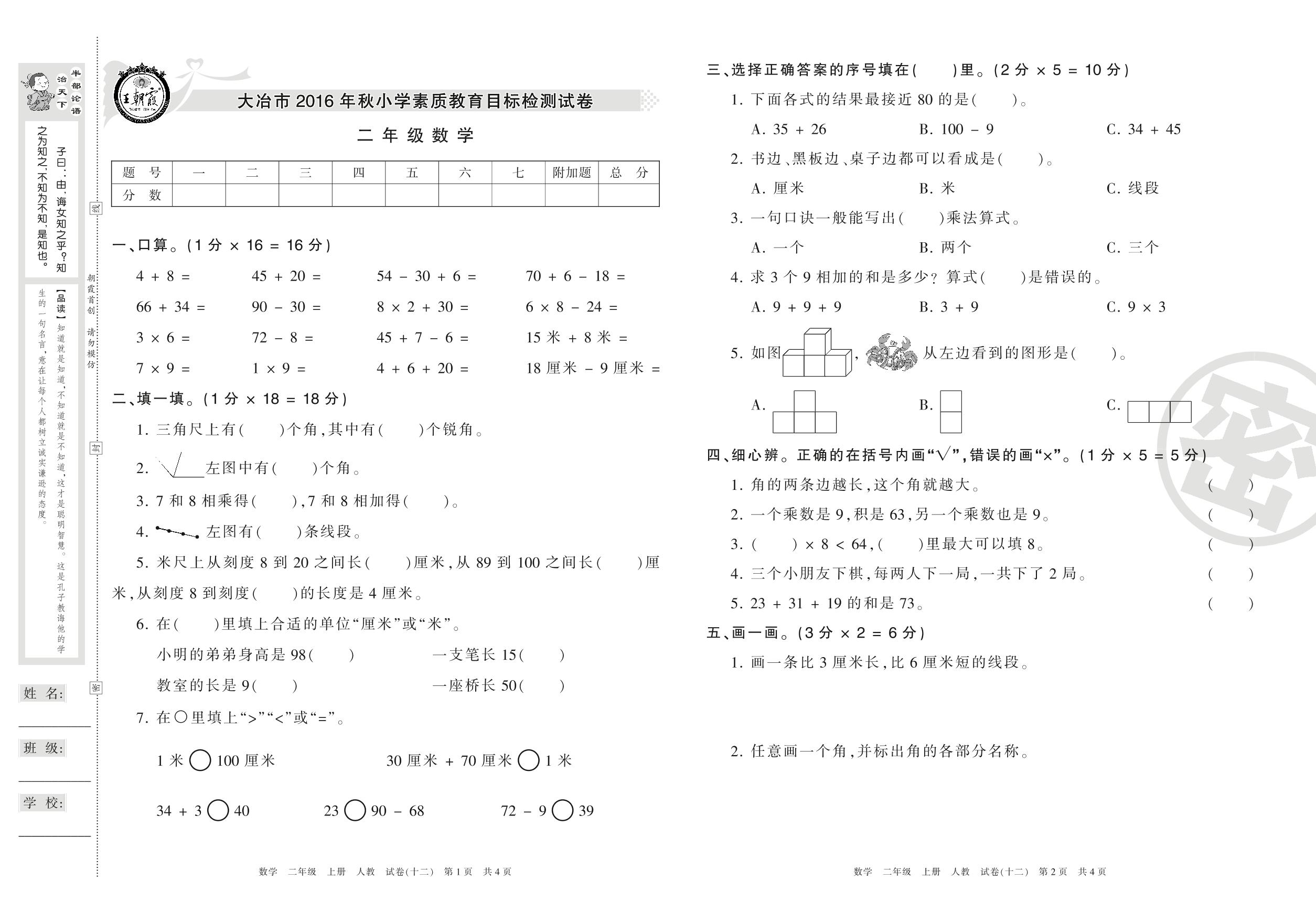 2016-2017学年第一学期大冶市二年级数学试卷(人教版)【12】