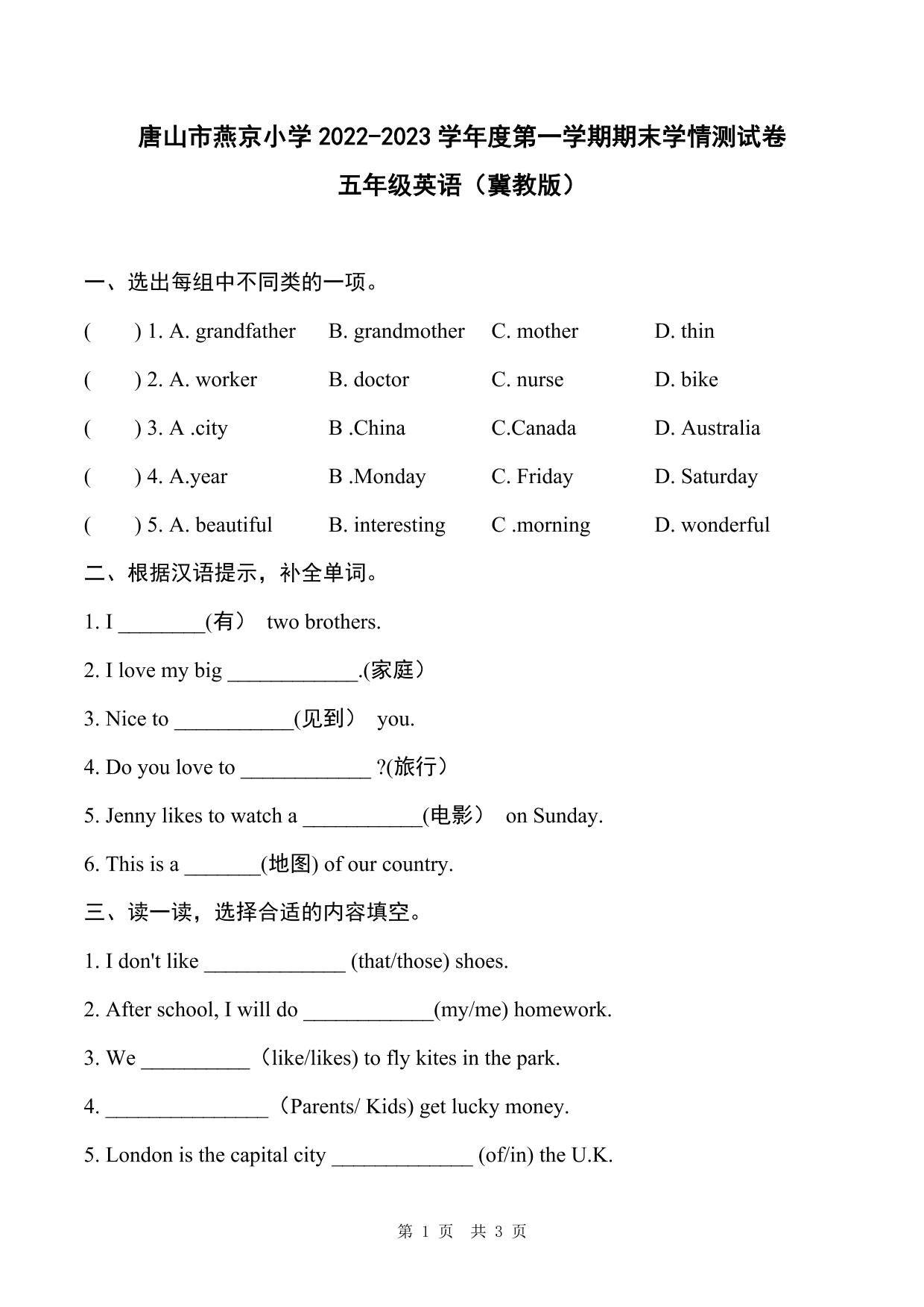 河北省唐山市路南区燕京小学2022-2023学年度第一学期期末学情测试五年级英语(冀教版)【无听力音频】