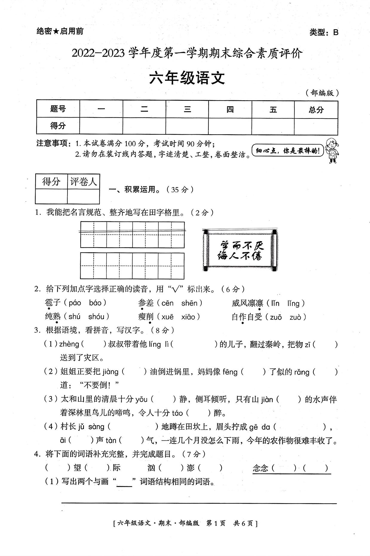 陕西省延安市富县2022-2023学年度第一学期期末综合素质评价试卷六年级语文(人教版)
