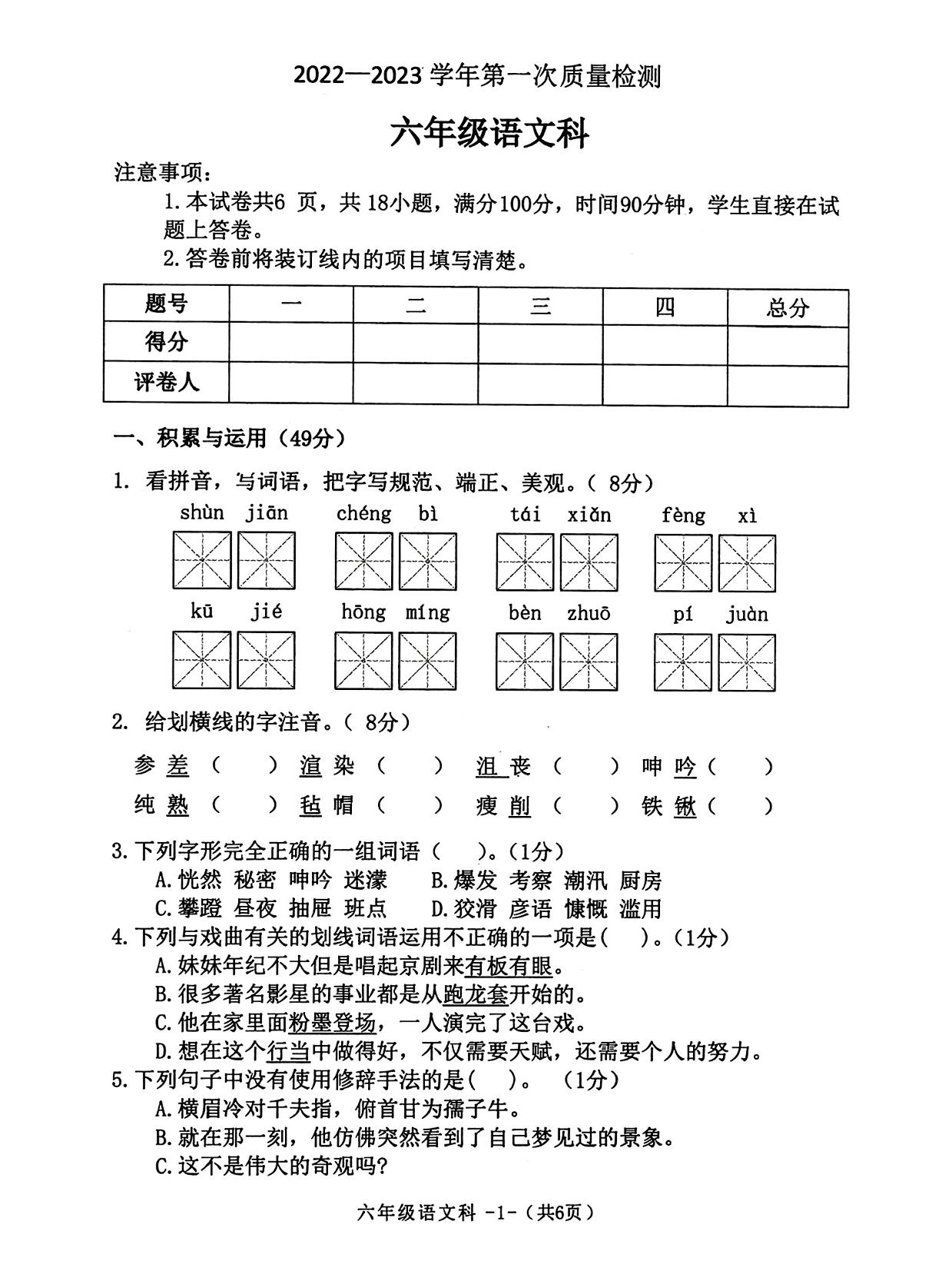 陕西省咸阳市泾阳县2022-2023学年下学期第一次质量检测(上期末)六年级语文(人教版)