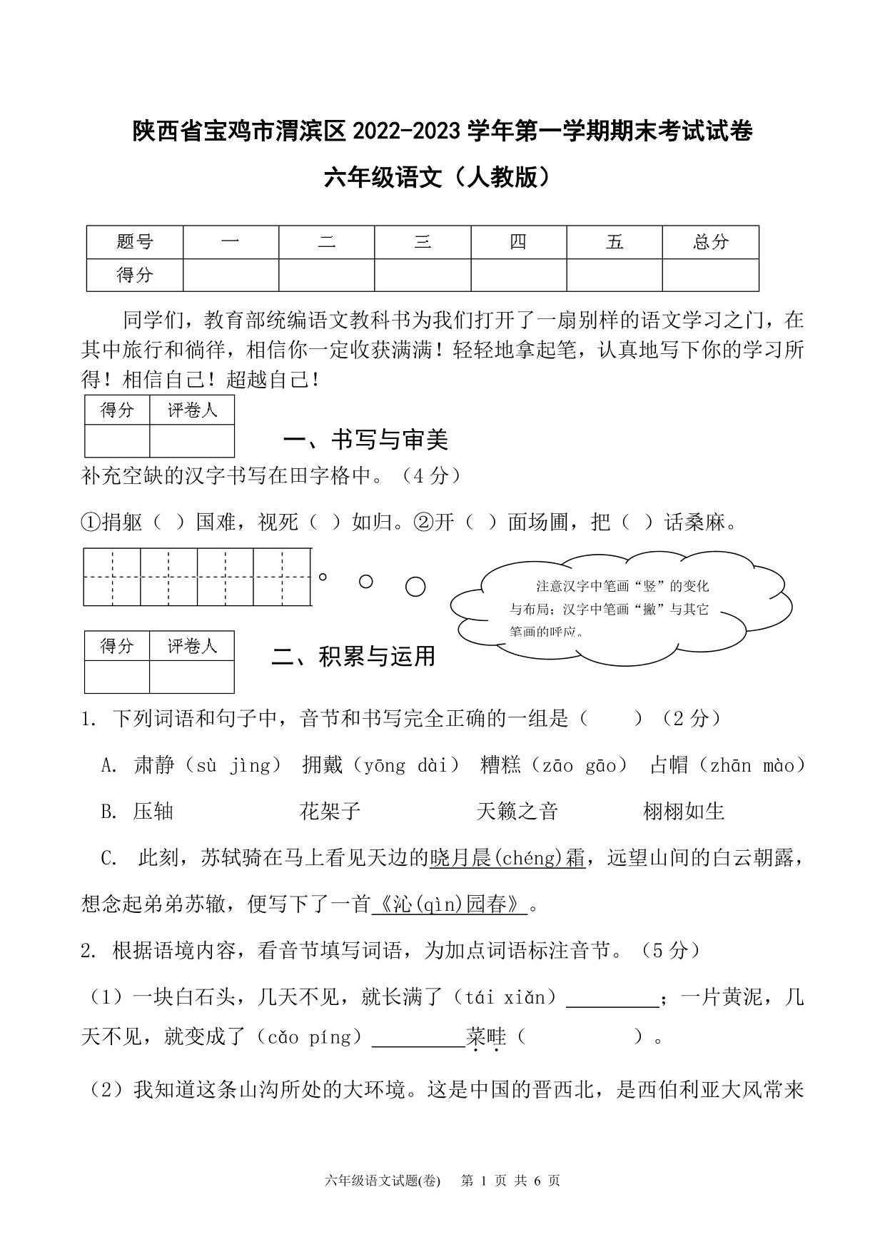 陕西省宝鸡市渭滨区2022-2023学年第一学期期末考试试卷六年级语文(人教版)