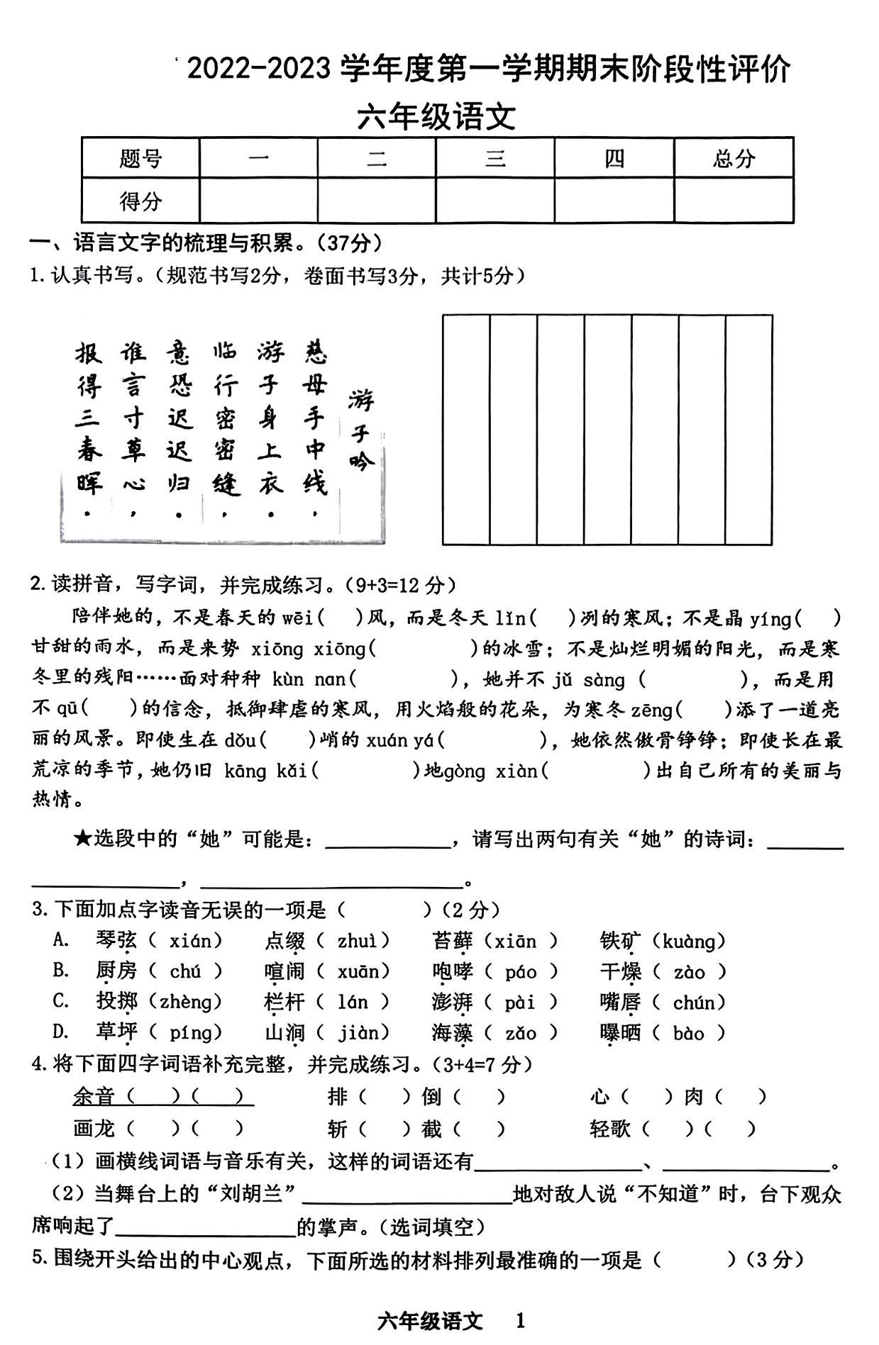 陕西省延安市吴起县2022-2023学年度第一学期期末阶段性评价试卷六年级语文(人教版)