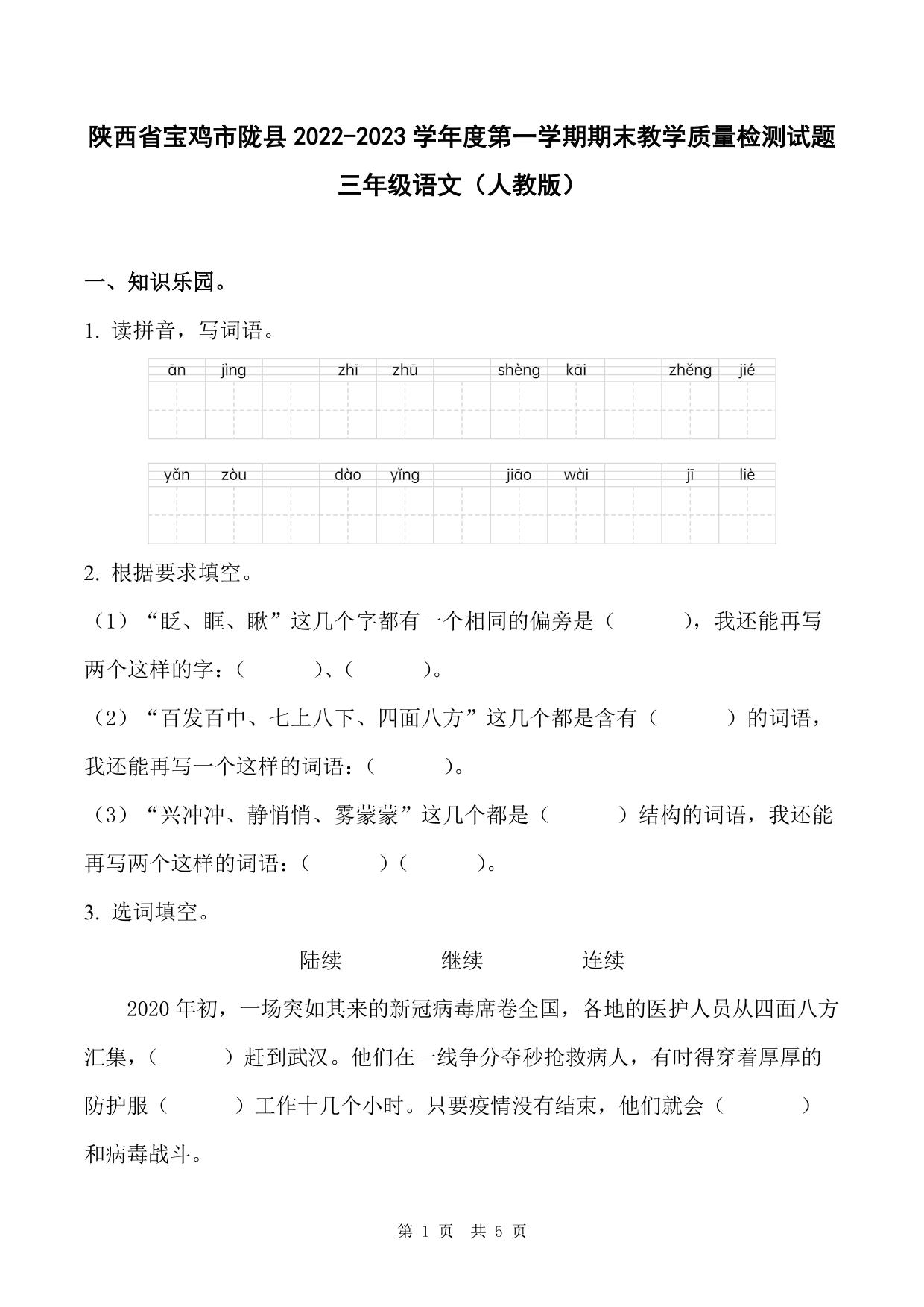 陕西省宝鸡市陇县2022-2023学年度第一学期期末教学质量检测试题三年级语文(人教版)