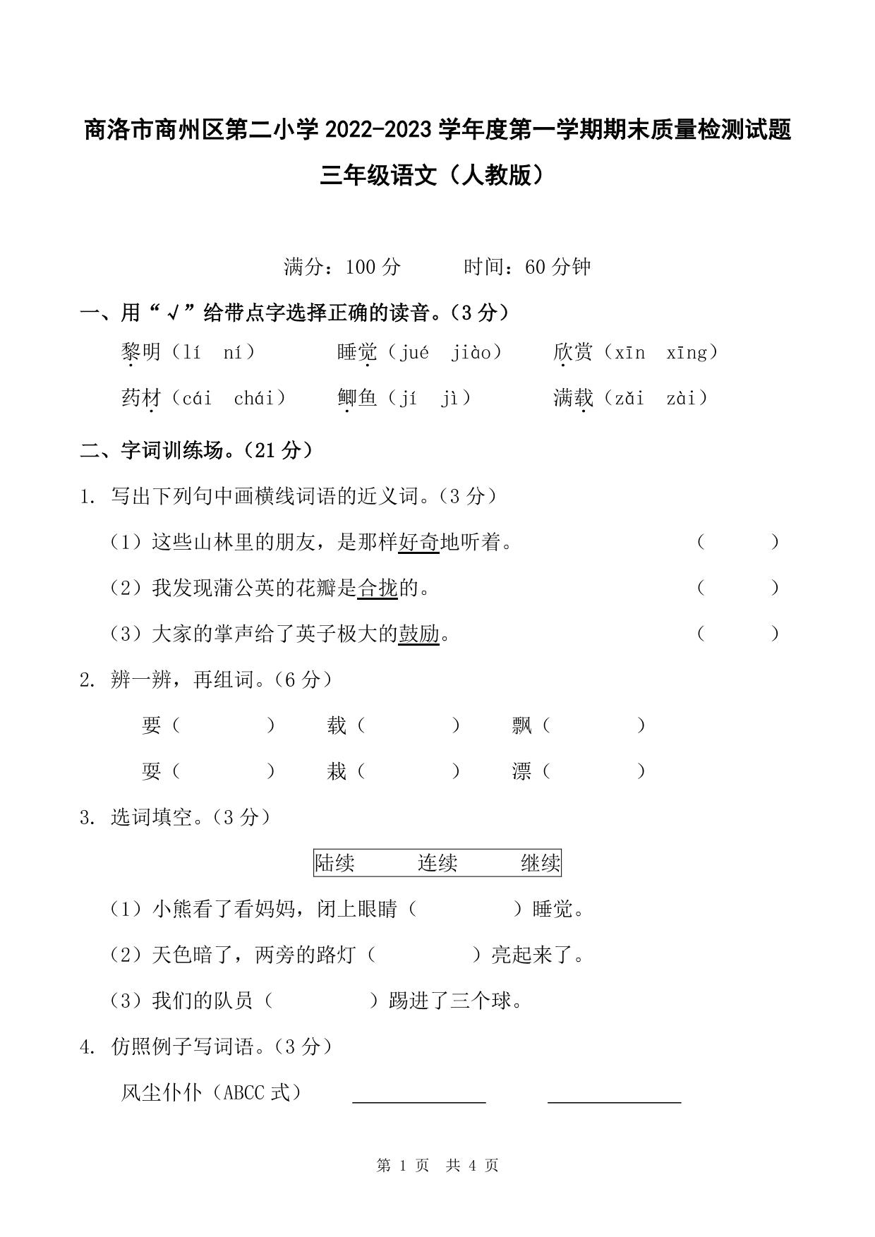 陕西省商洛市商州区第二小学2022-2023学年度第一学期期末质量检测试题三年级语文(人教版)