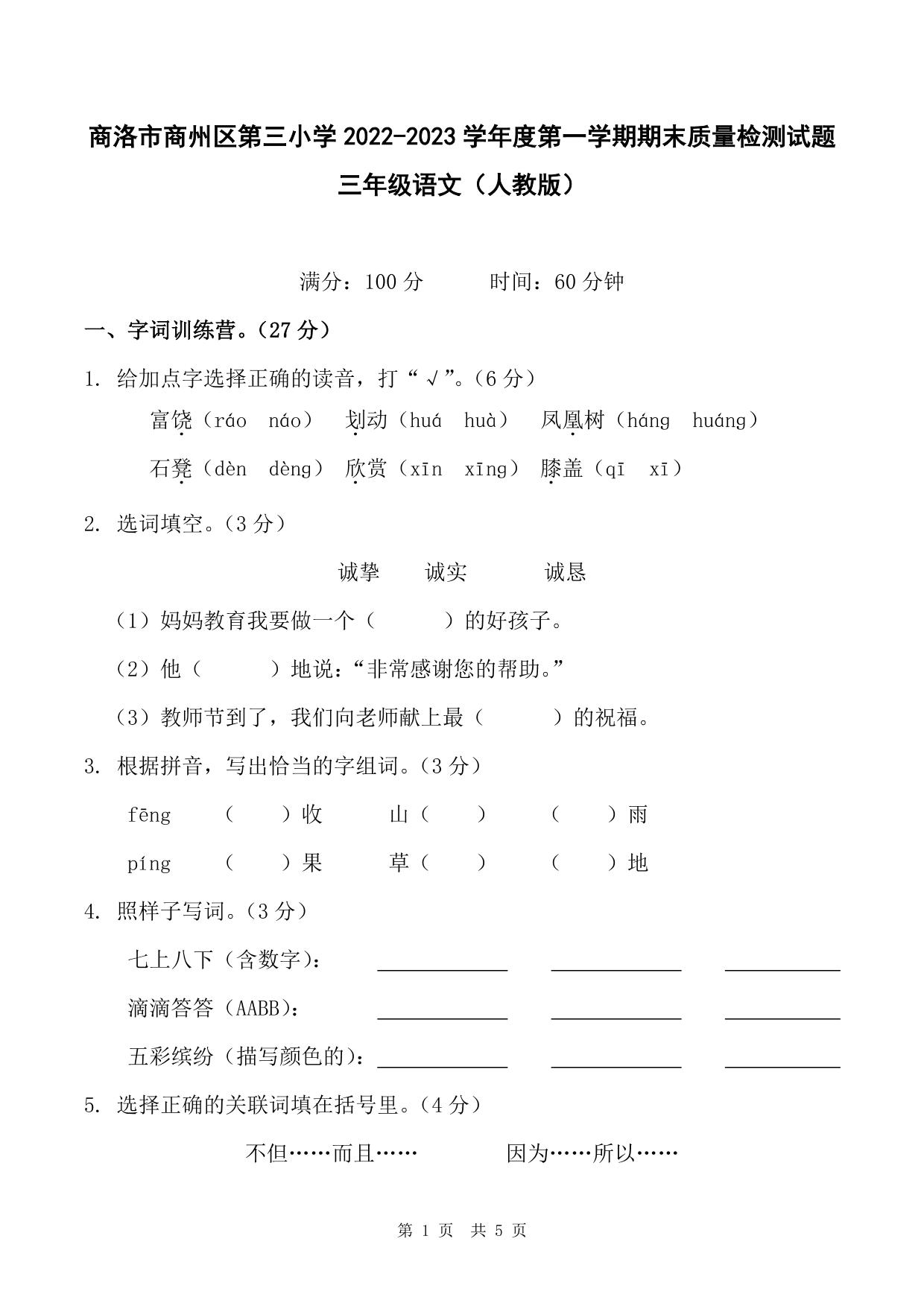 陕西省商洛市商州区第三小学2022-2023学年度第一学期期末质量检测试题三年级语文(人教版)