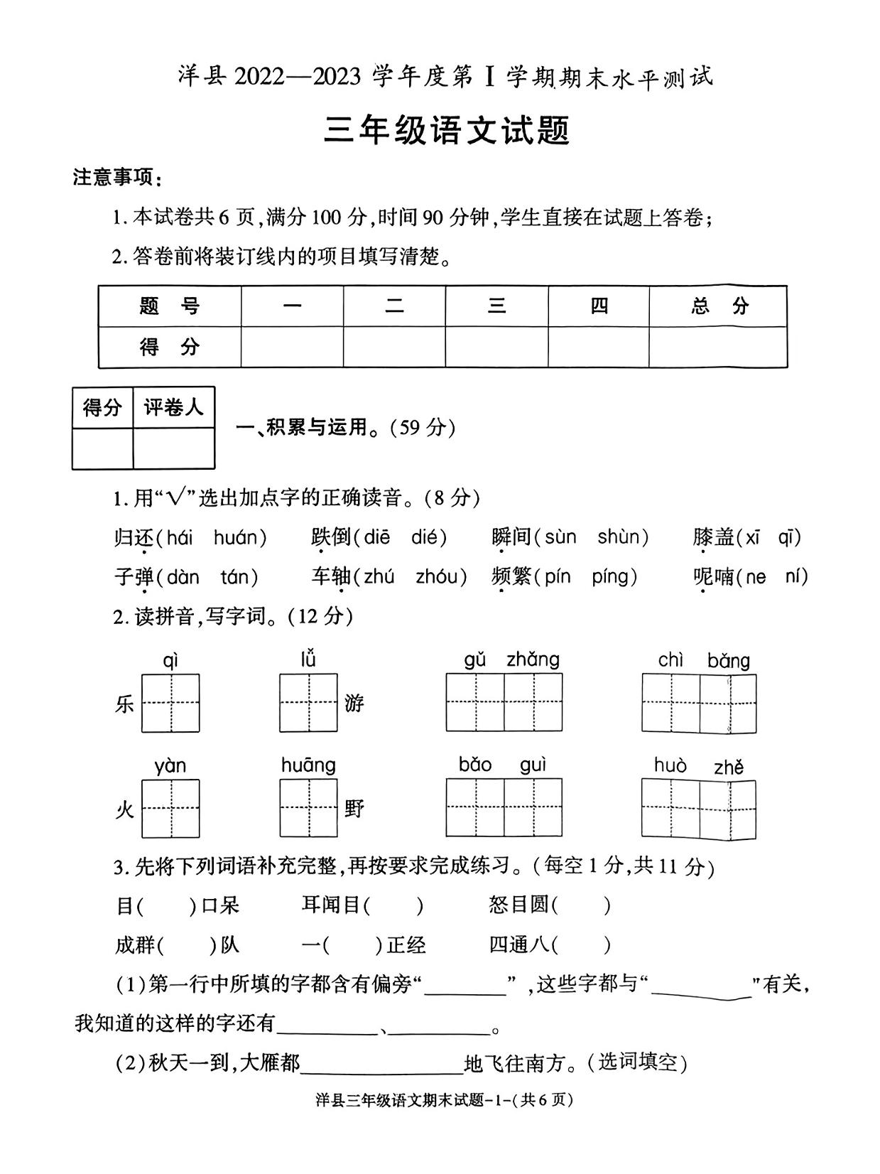 陕西省汉中市洋县2022-2023学年度第一学期期末水平测试试题三年级语文(人教版)