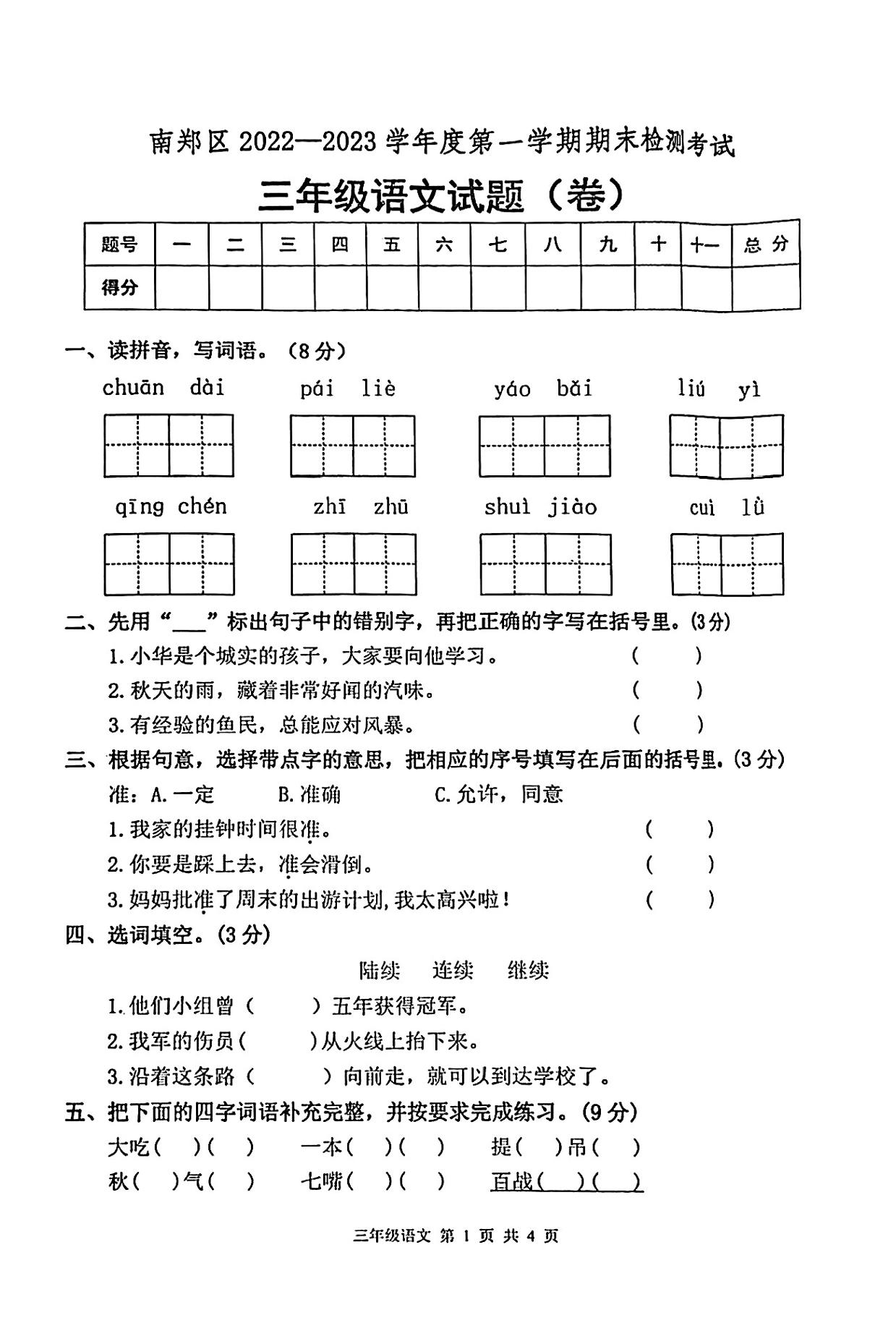 陕西省汉中市南郑区2022-2023学年度第一学期期末检测考试试题三年级语文(人教版)