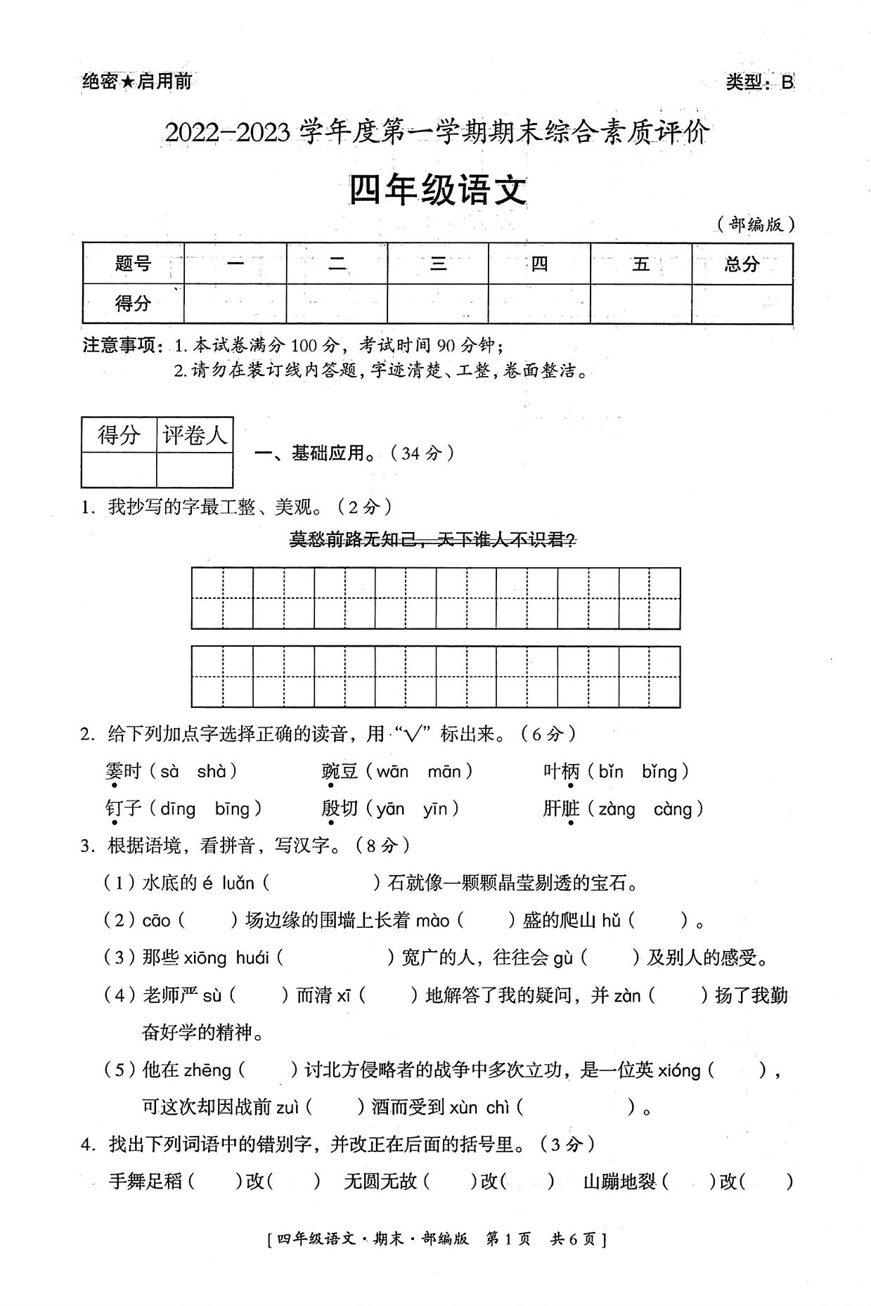 陕西省延安市富县2022-2023学年度第一学期期末综合素质评价试卷四年级语文(人教版)
