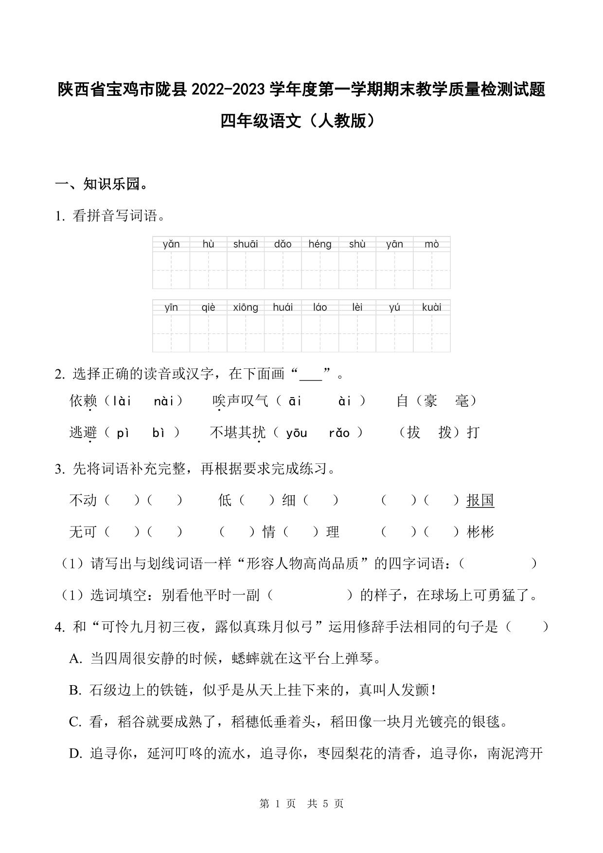 陕西省宝鸡市陇县2022-2023学年度第一学期期末教学质量检测试题四年级语文(人教版)