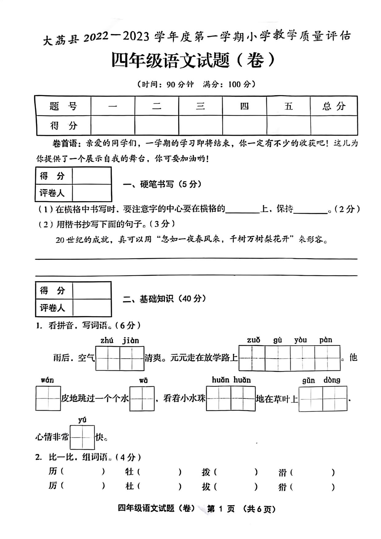 陕西省渭南市大荔县2022-2023学年度第一学期期末教学质量评估试题四年级语文(人教版)