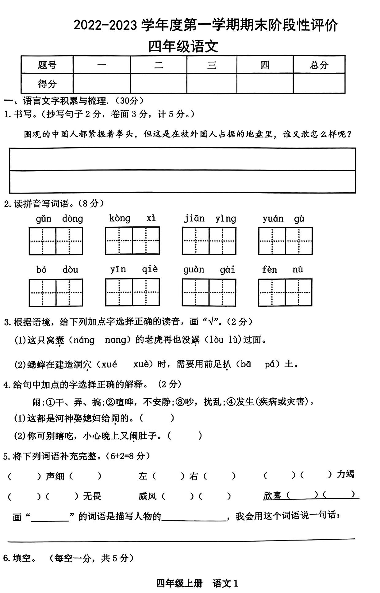 陕西省延安市吴起县2022-2023学年度第一学期期末阶段性评价试卷四年级语文(人教版)