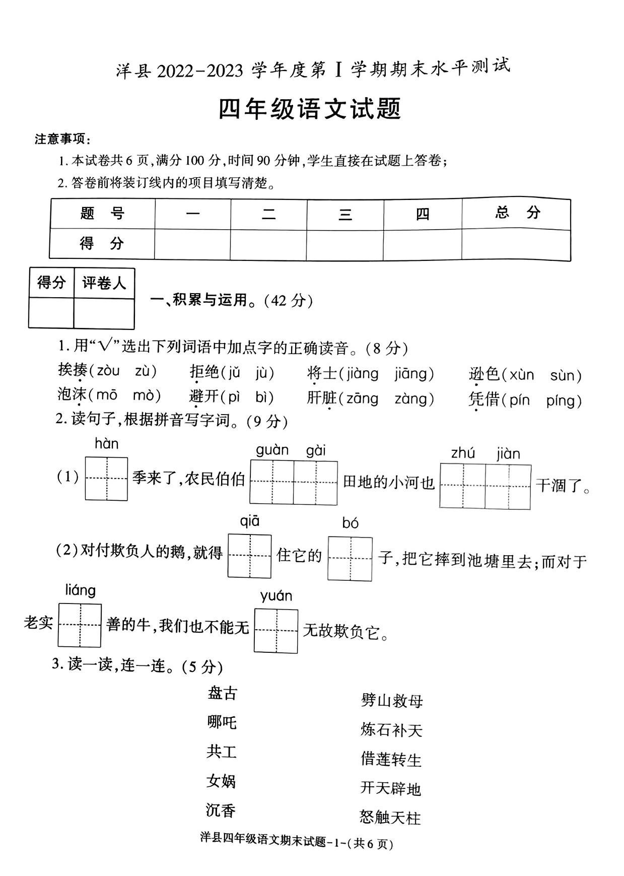 陕西省汉中市洋县2022-2023学年度第一学期期末水平测试试题四年级语文(人教版)