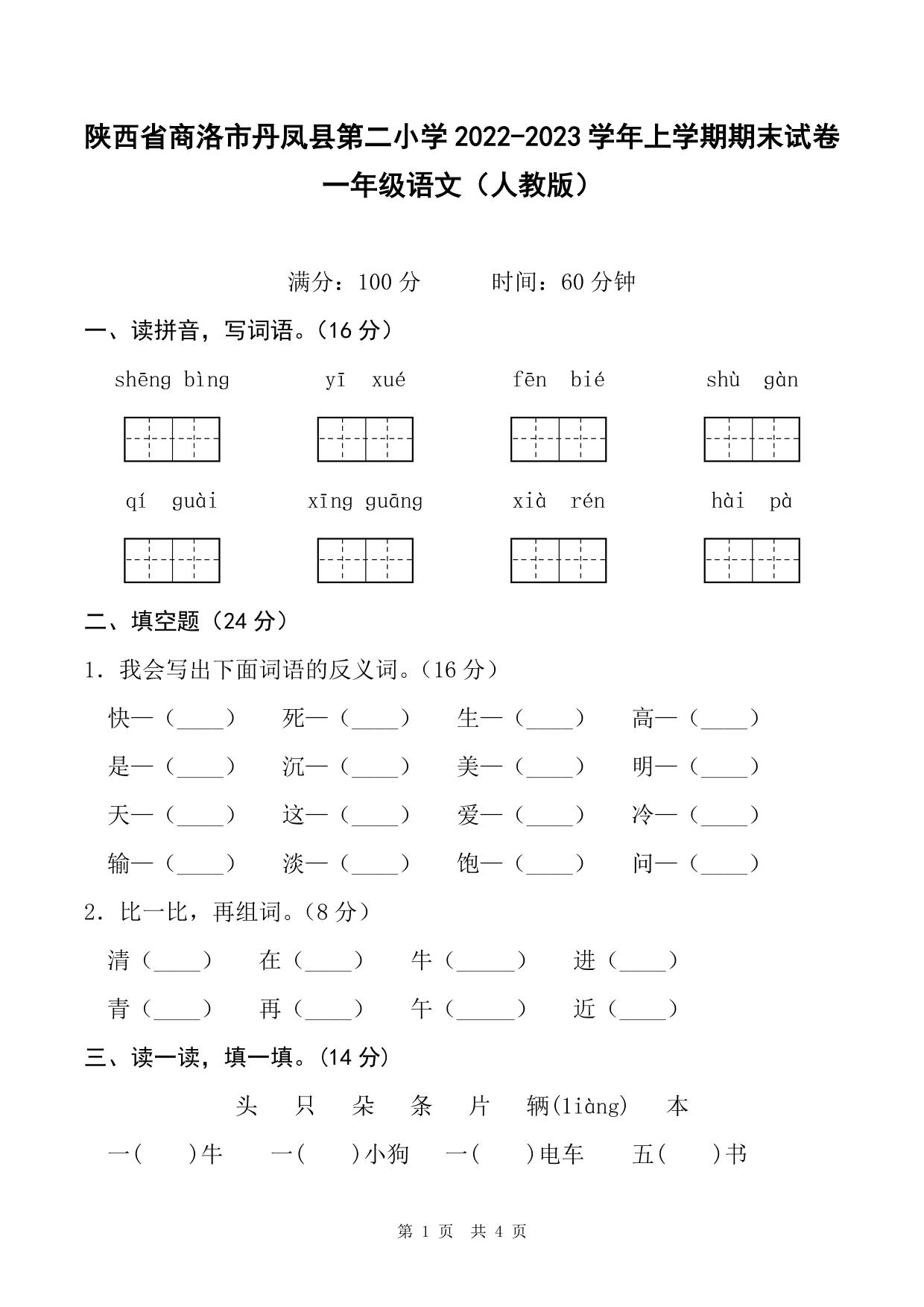 陕西省商洛市丹凤县第二小学2022-2023学年上学期期末试卷一年级语文(人教版)
