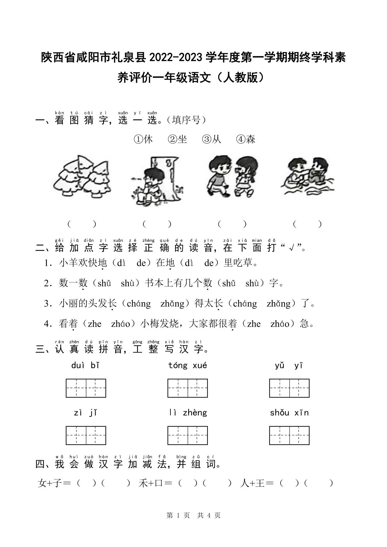 陕西省咸阳市礼泉县2022-2023学年第一学期期终学科素养评价试卷一年级语文(人教版)