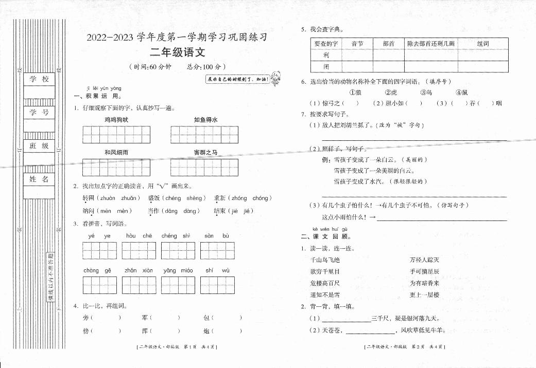 陕西省延安市富县2022-2023学年度第一学期期末学习巩固练习试卷二年级语文(人教版)