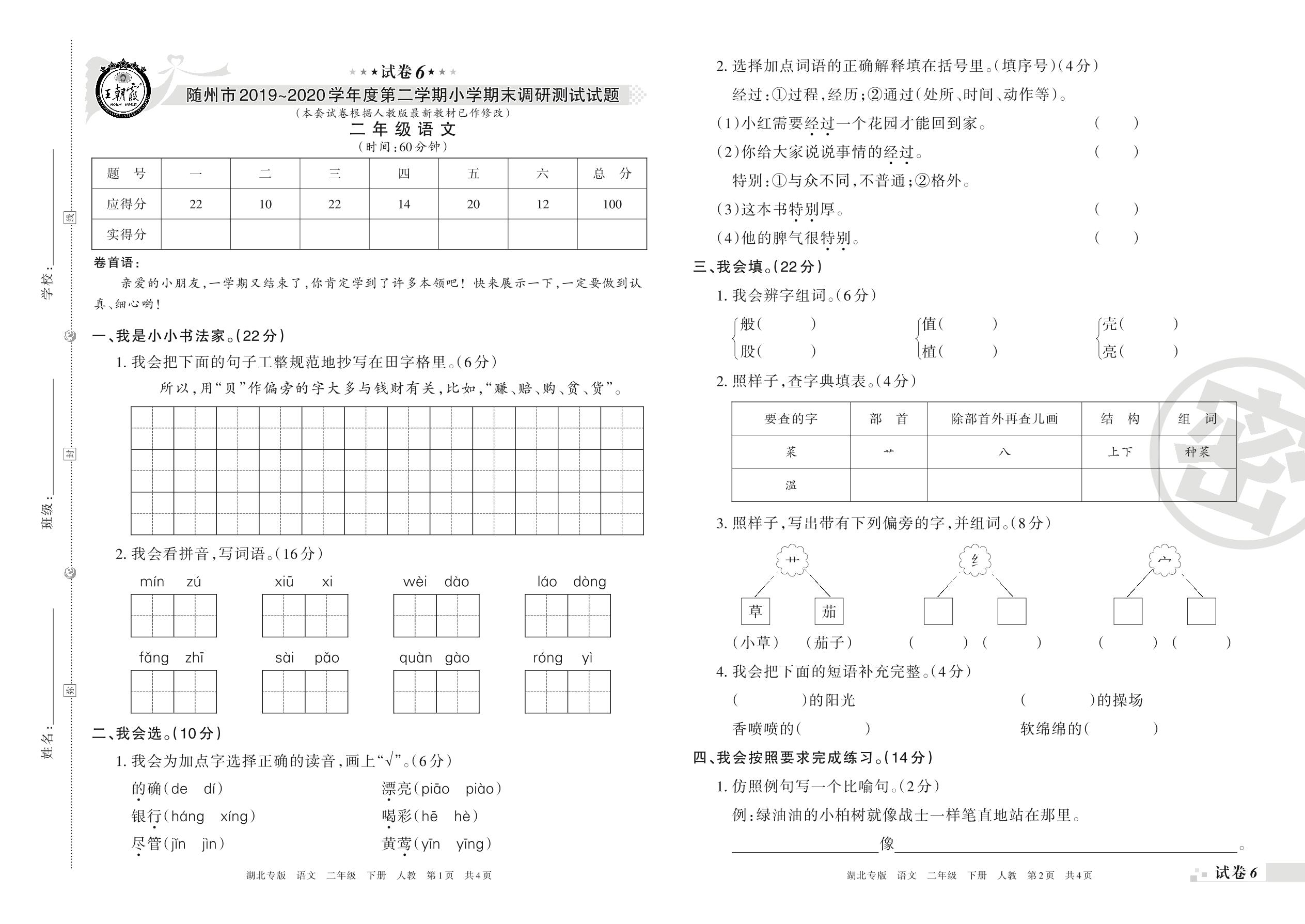 2019-2020学年第二学期随州市二年级语文试卷(人教版)【6】